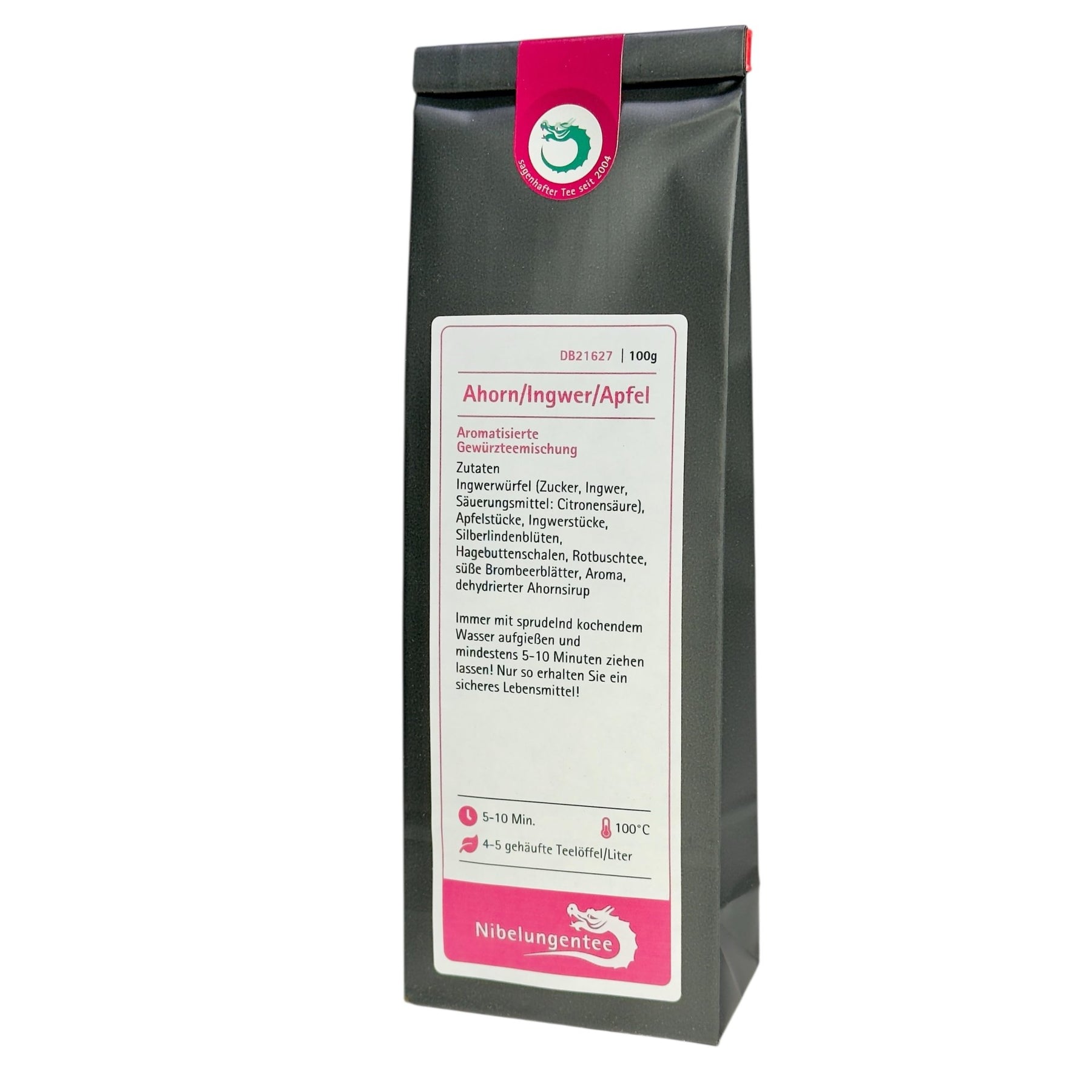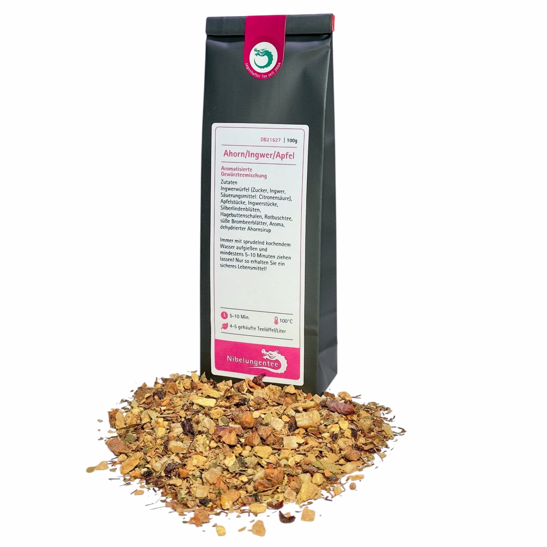Zutaten: Ingwerwürfel (Zucker, Ingwer, Säuerungsmittel: Citronensäure), Apfelstücke, Ingwerstücke, Silberlindenblüten, Hagebuttenschalen, Rotbuschtee, süße Brombeerblätter, Aroma, dehydrierter Ahornsirup
