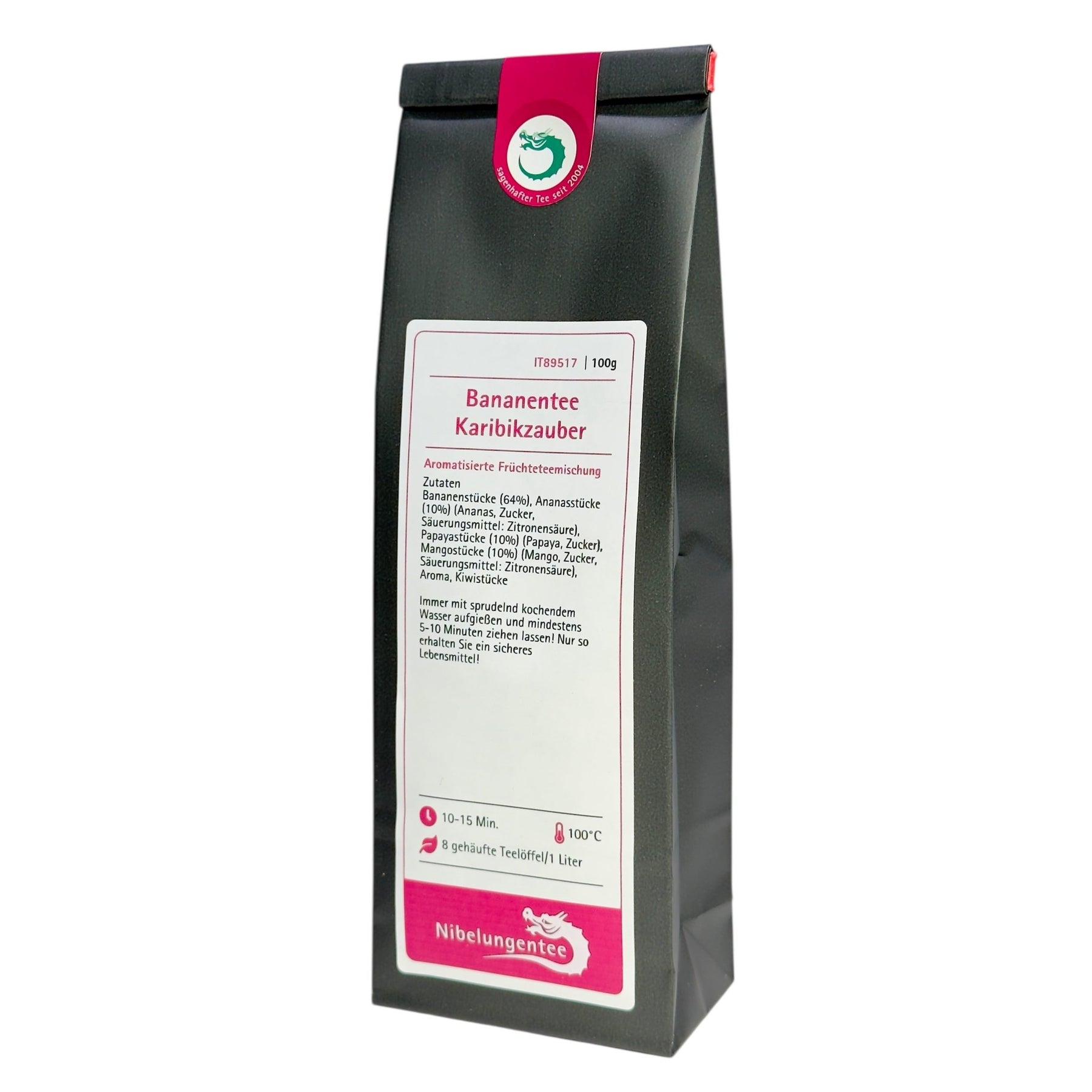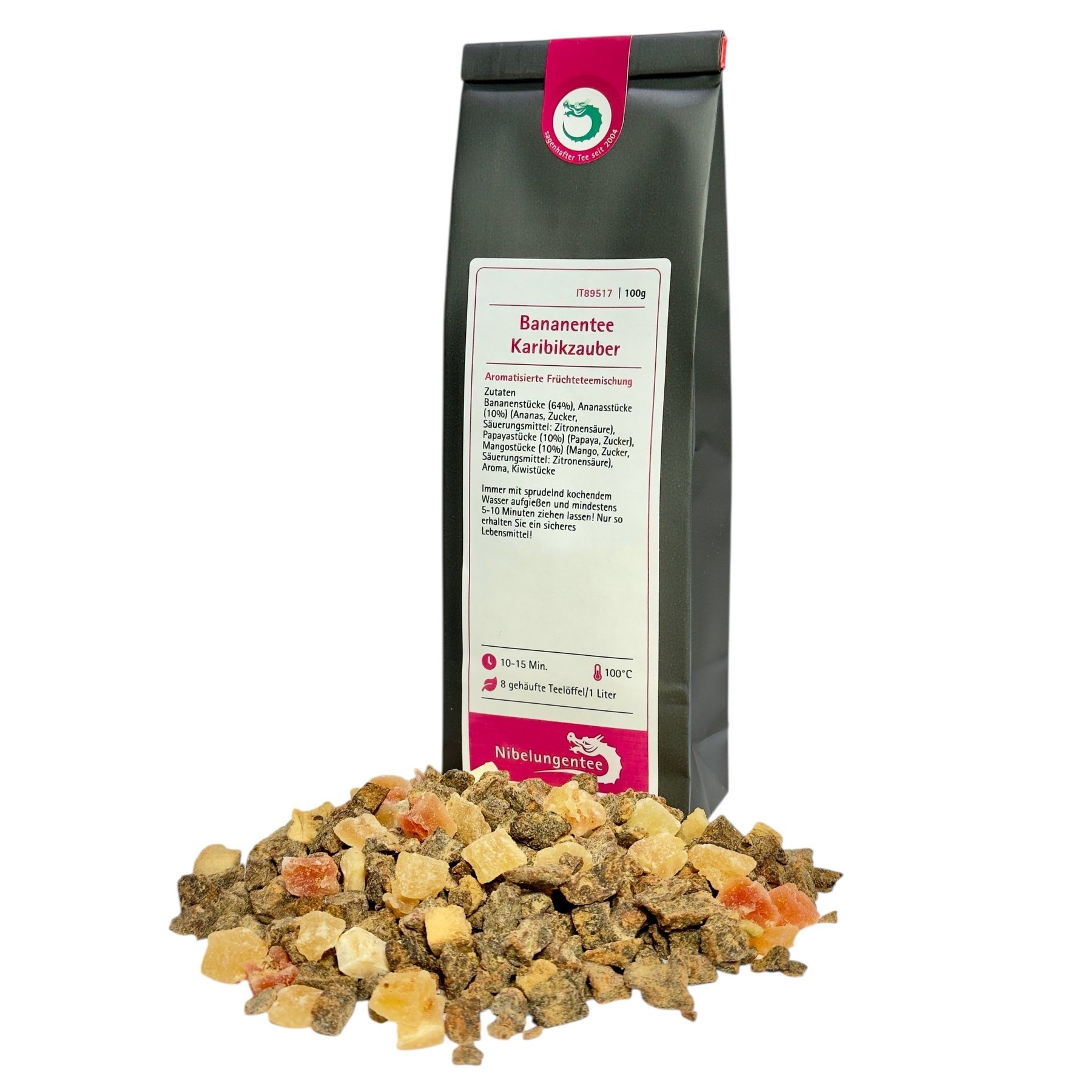 Diese sonnige Teemischung lässt Genießerherzen höher schlagen. Der weiche Geschmack der Bananen erhält durch die charaktervolle Fruchtigkeit von Papaya und Mango eine sinnliche Note, die mit der leichten Säure von Kiwi und Ananas einen lebendigen Verbindung eingeht. Der Bananentee Karibikzauber ist das richtige Getränk für die kleinen Urlaubsmomente im Alltag, er lässt sich kalt ebenso genießen wie heiß.