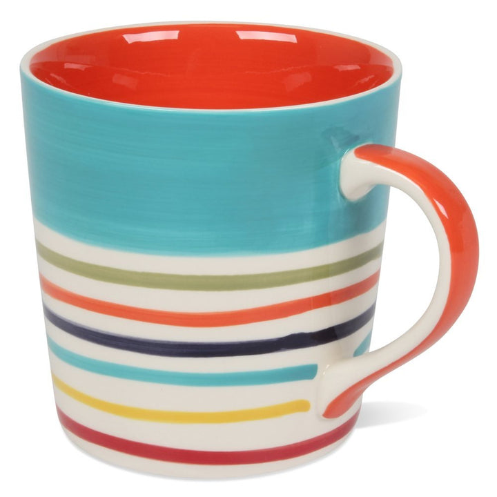 Der eine Becher hat einen roten großen Balken, Griff und Innen Seite ist türkis. Und der andere Becher ? Tataaaa: Genau umgekehrt. Wobei im Farbton jeweils etwas heller (Also fast Orange statt Rot).