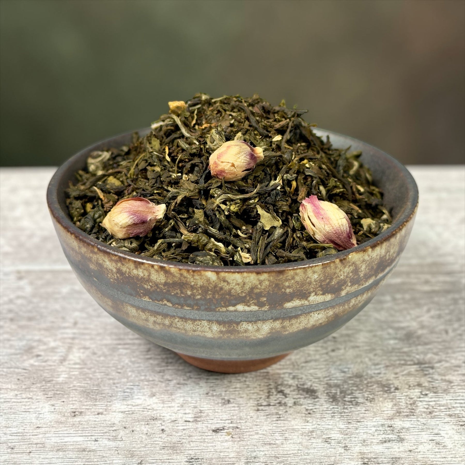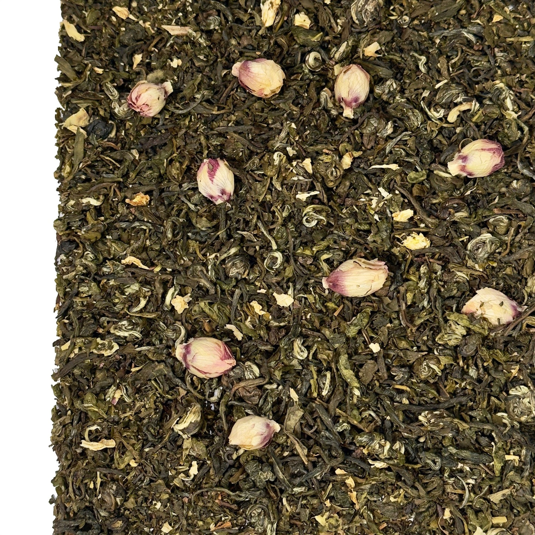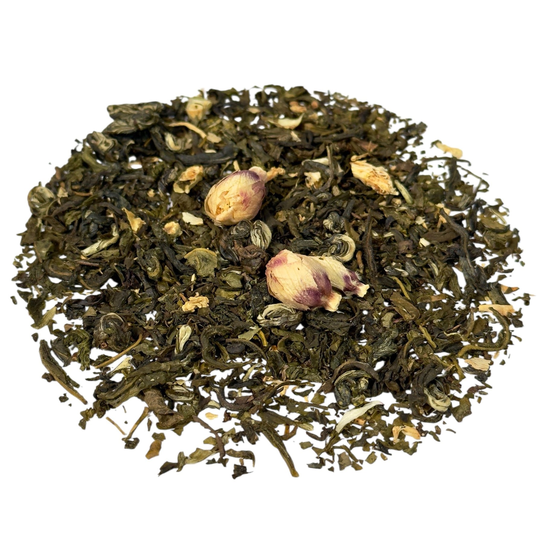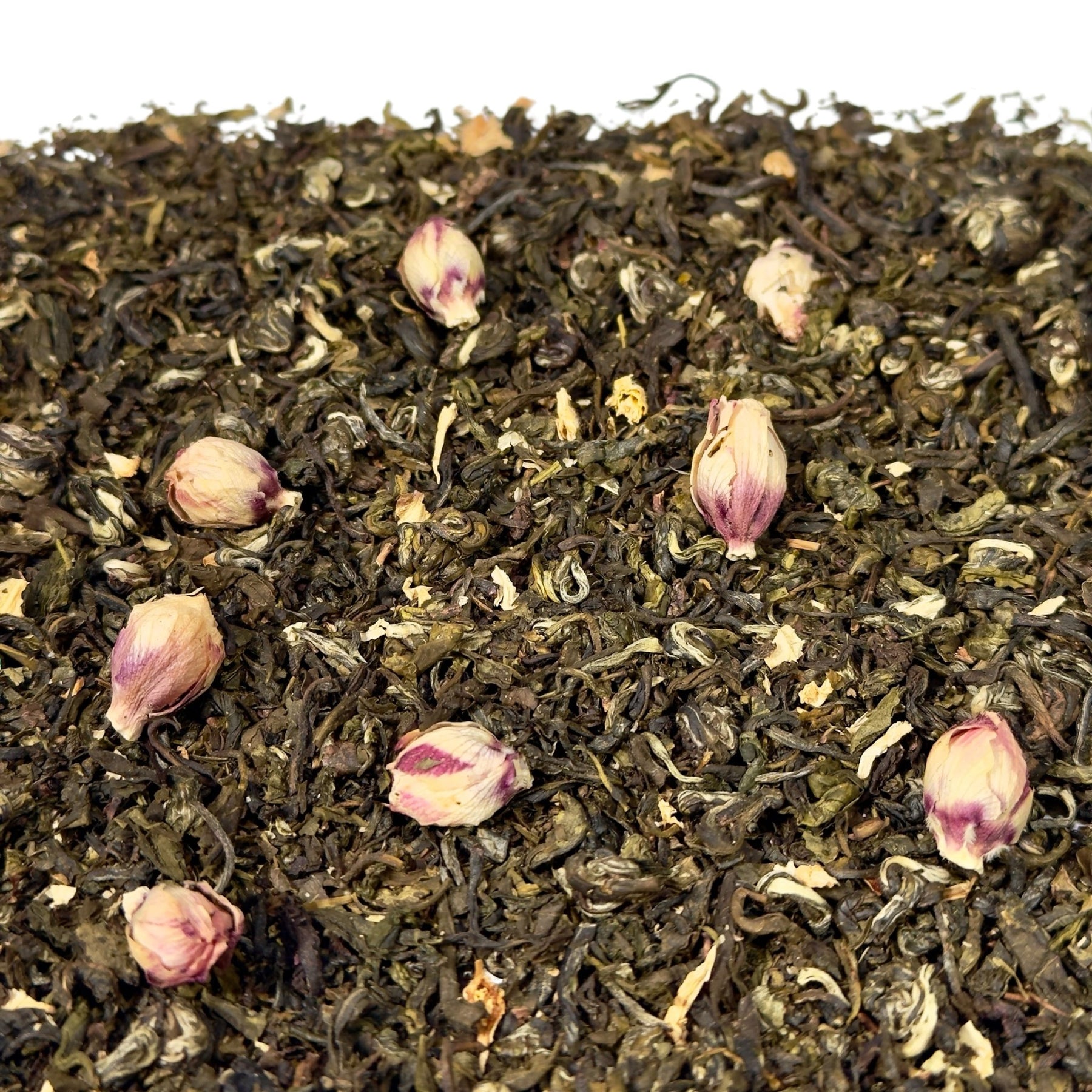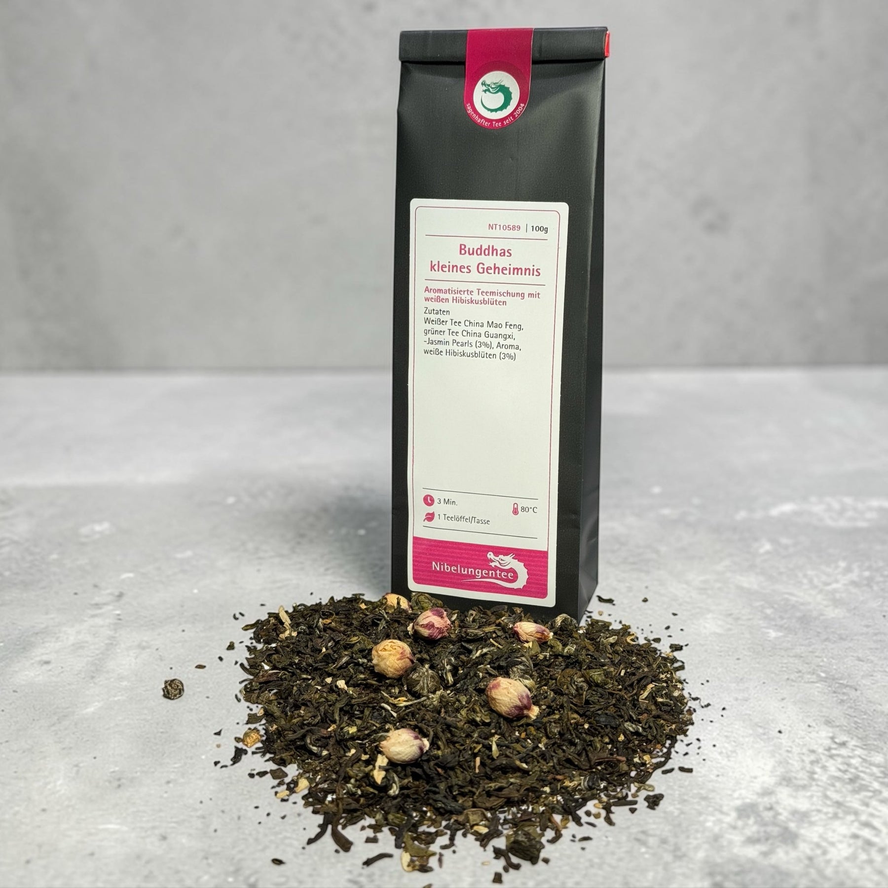 Ein echter Blickfang in der Mischung sind die sogenannten Jasmin‑Perlen. Diese kunstvoll gerollten kleinen Kügelchen entfalten im Aufguss nach und nach ihr blumiges Aroma und geben der Tasse eine elegante Note. Weißliche Hibiskusblüten setzen zusätzlich leichte, blumige Akzente und sorgen dafür, dass der Tee nicht nur geschmacklich, sondern auch im Aufgussbild Freude bereitet.