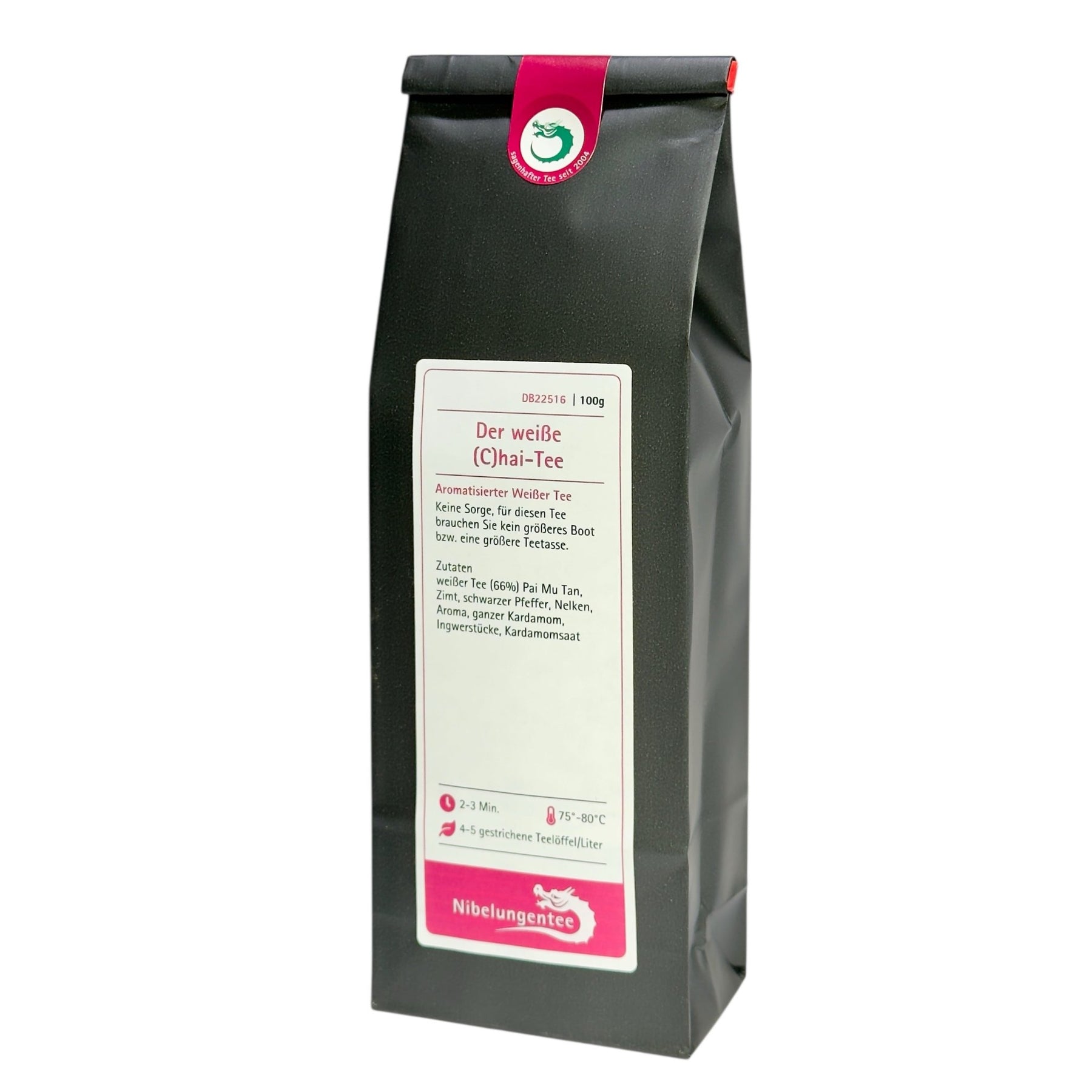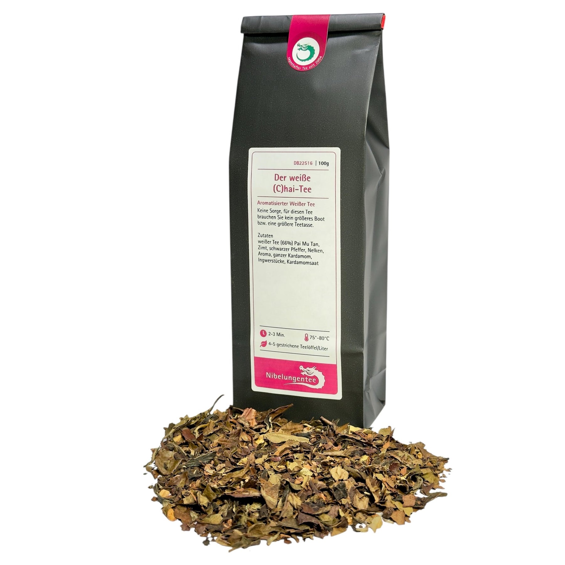 Die Basis dieser Mischung bildet ein sanfter Weißtee, der dem klassischen Chai-Gewürzensemble eine besonders feine Note verleiht. Zimt, Kardamom, Ingwer und ein Hauch von Pfeffer bringen genau die richtige Portion Wärme und Exotik ins Spiel. Abgerundet wird das Ganze durch eine sanfte Süße, die das Aroma perfekt ausbalanciert. Das Ergebnis? Ein Chai, der nicht nur würzig, sondern auch herrlich cremig schmeckt und definitiv Lust auf mehr macht.