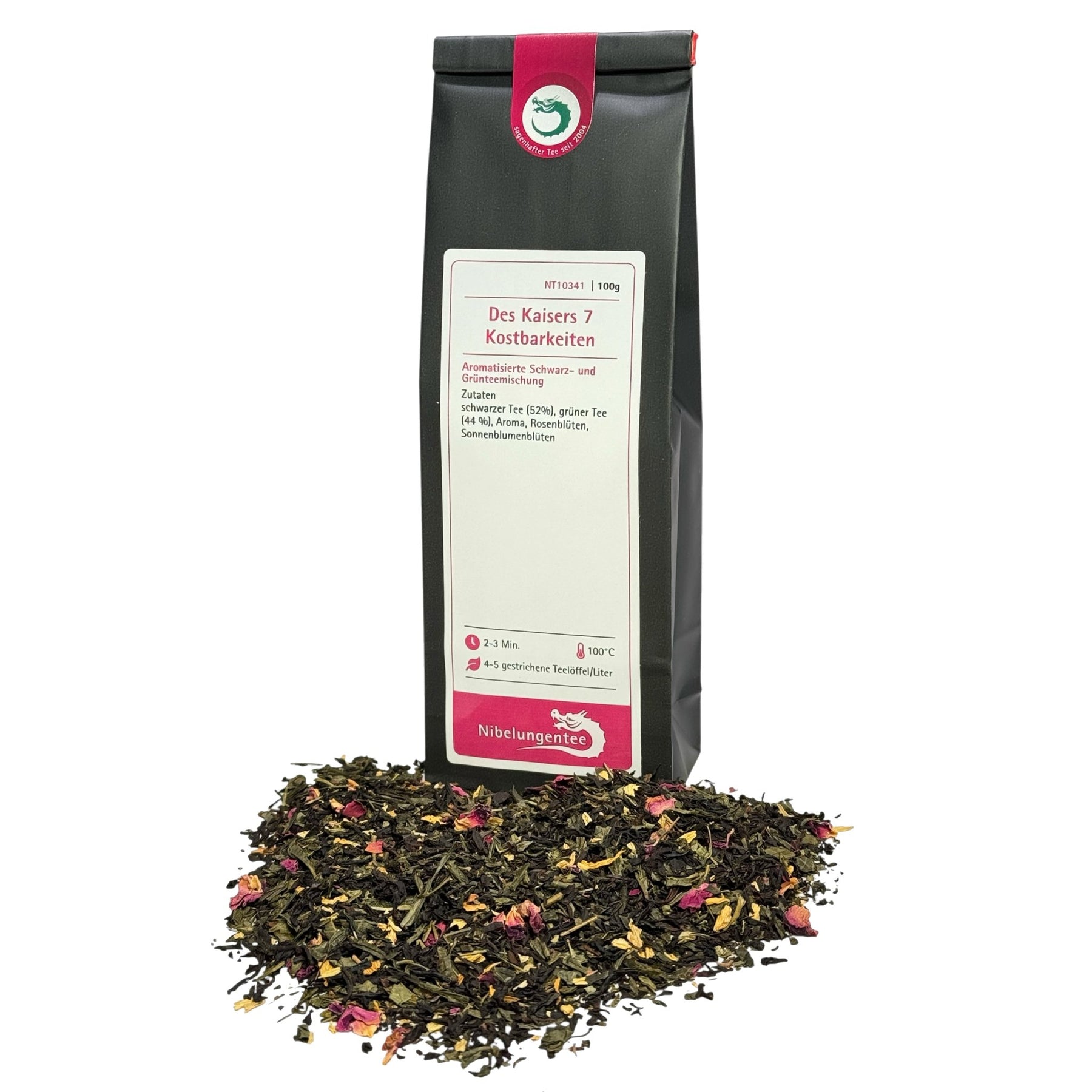 | Zutaten: | schwarzer Tee (52%), grüner Tee (44 %), Aroma, Rosenblüten, Sonnenblumenblüten |