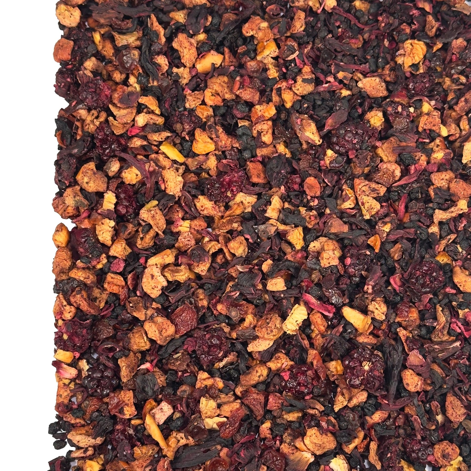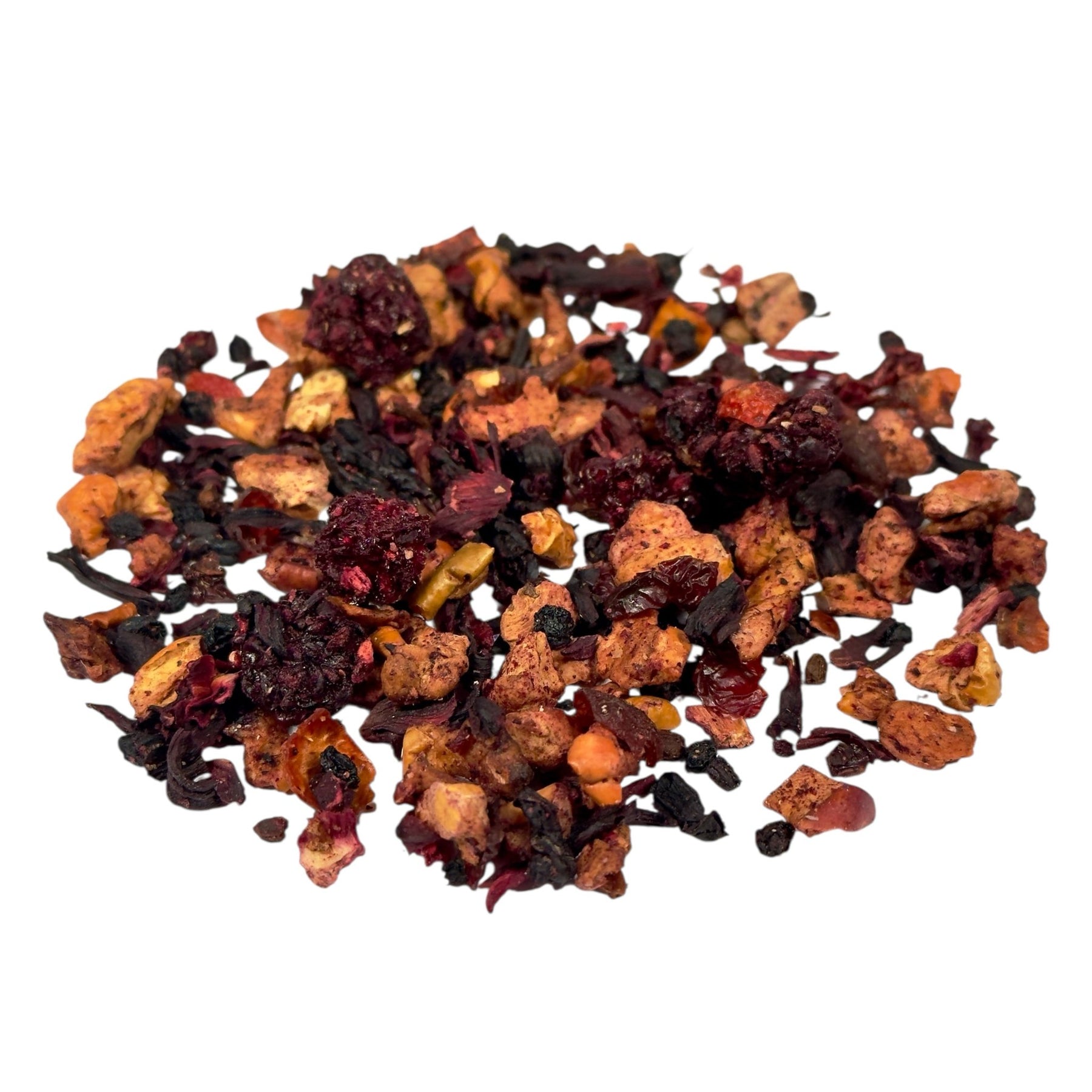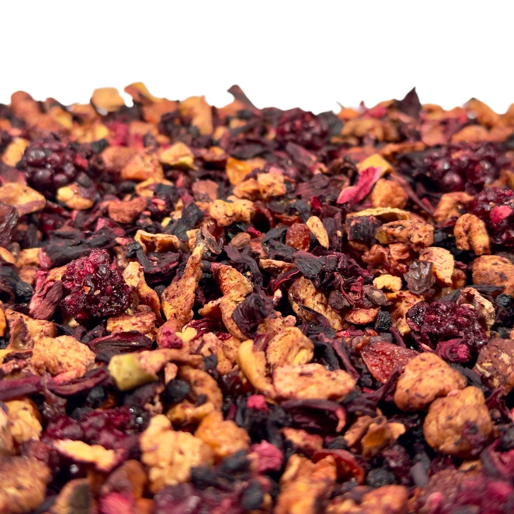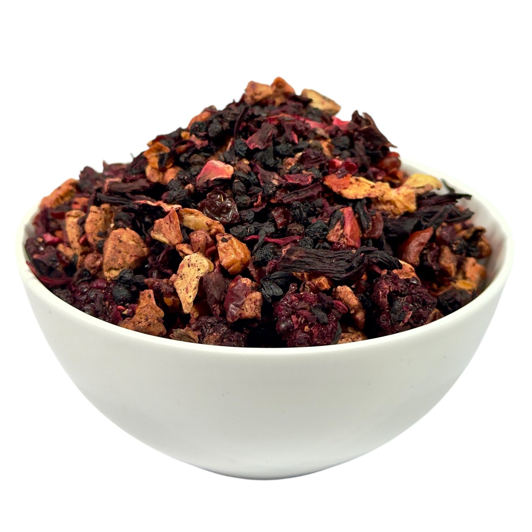 Erlesene Früchte der Natur haben wir zu einer obstkorbbunten Mischung zusammengestellt. Diese beinhaltet alle geschmacklichen Sinnbilder, die zu einem leckeren Sommergenuss gehören: reife Erdbeeren, liebliche Himbeeren und aromatische Kirschen und Brombeeren. Zutaten aus prallen Äpfeln, ergiebiger Hibiskus und heimische Hagebutte bieten ein fruchtiges Fundament für die eben angepriesenen Rotfrüchte. Entsprechend ausgewählte Aromen runden dieses reichhaltige Versprechen zu einem gänzlich befriedigenden Genuss ab.