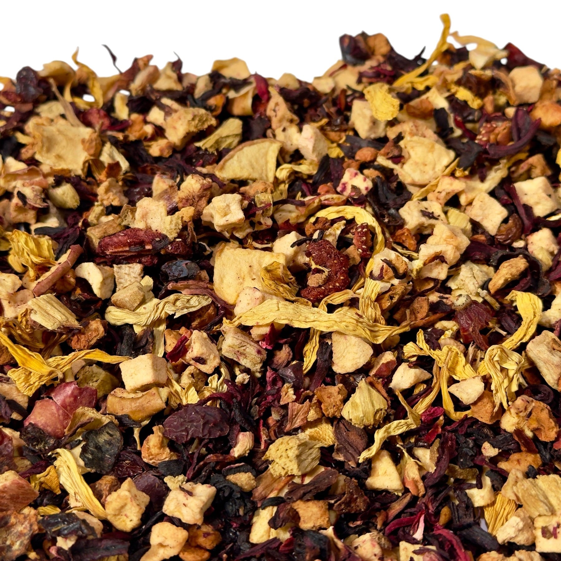 Zutaten: Hibiskusblüten (39%), Apfelstücke, Hagebuttenschalen, gesäuerte Apfelstücke (Salz, Säuerungsmittel: Zitronensäure, Äpfel, Antioxidationsmittel: Ascorbinsäure), geviertelte Apfelscheiben (6%), Aromen, Orangenschalen, natürliches Aroma, Sonnenblumenblüten, Rhabarberstücke (2%), Erdbeerscheiben (2%)