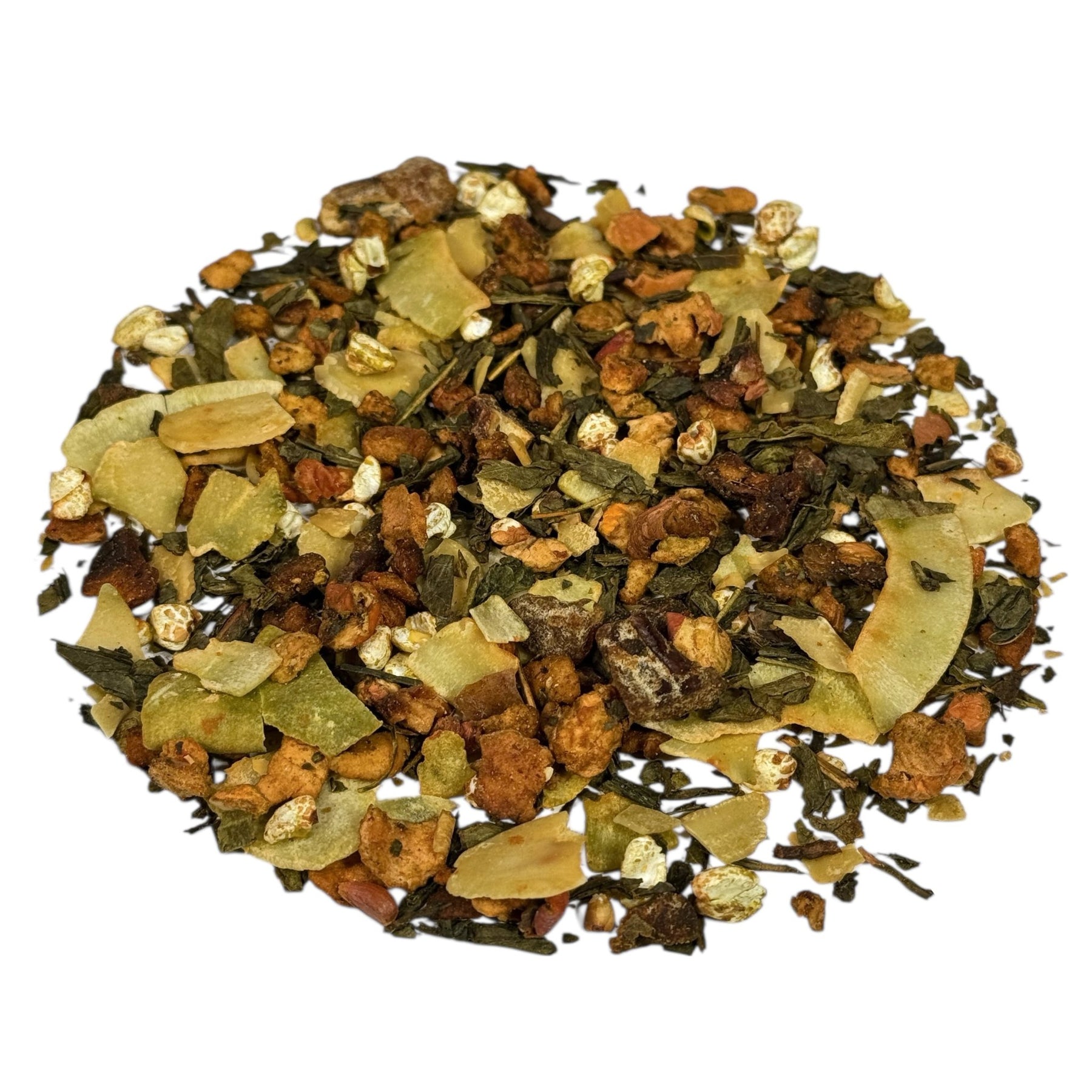 Zutaten: Apfelstücke, Dattelstücke (Datteln, Reismehl), Grüner Tee (14%), Kokosnusschips, MANDELSTÜCKE, gepoppter Buchweizen, Aroma, natürliches Aroma, japanischer Matcha Grüntee (1%)