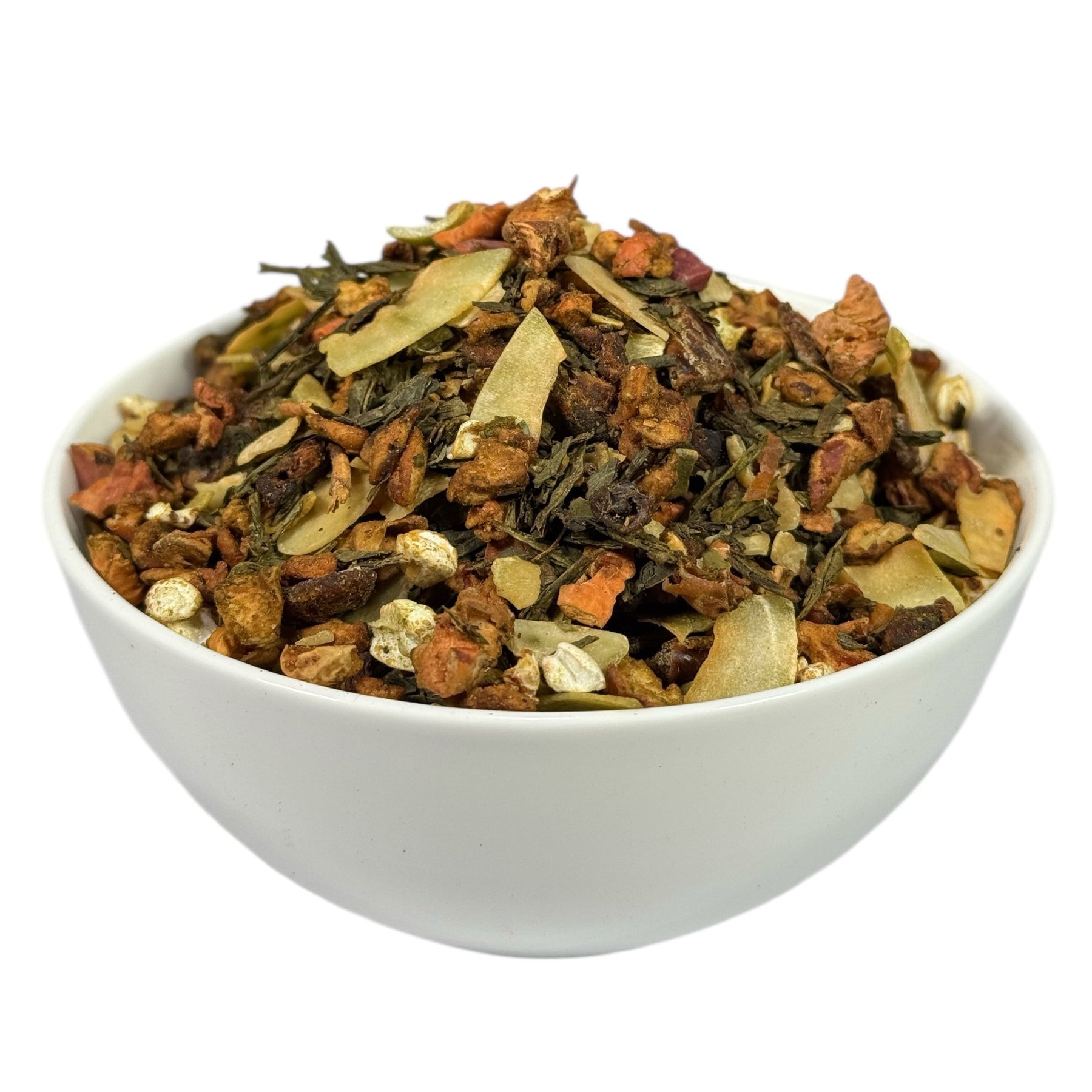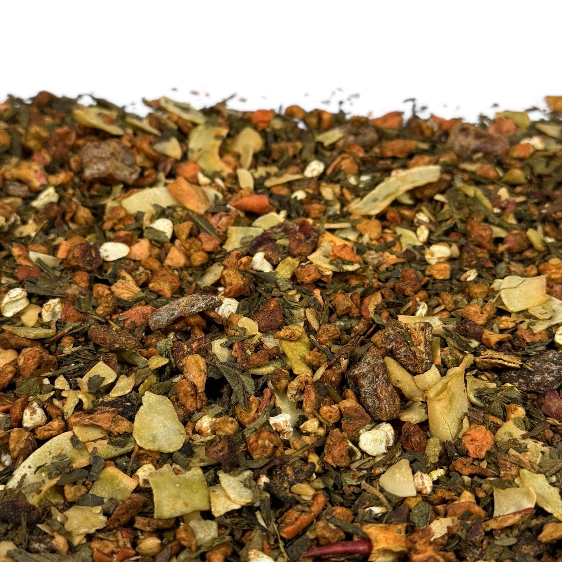 Diese Tee-Komposition ist alles andere als gewöhnlich. Die natürliche Fruchtigkeit trifft auf feine Matcha-Akzente, wodurch eine harmonische Balance entsteht. Während klassische Früchtetees oft süß und kräftig sind, bringt der grüne Anteil hier eine angenehme Tiefe und Eleganz hinein. Perfekt für alle, die ihren Tee-Genuss mit einem Hauch Raffinesse verbinden möchten.