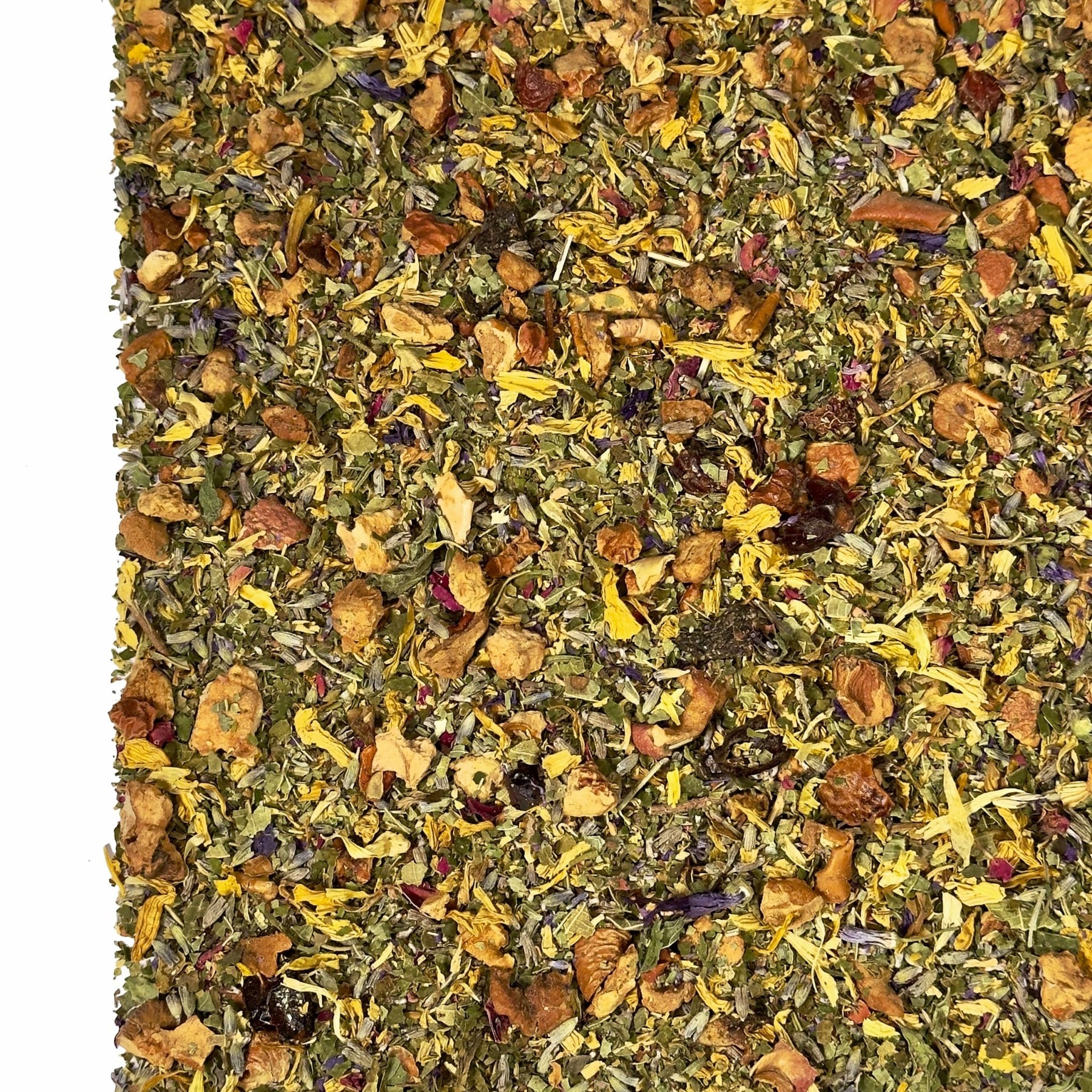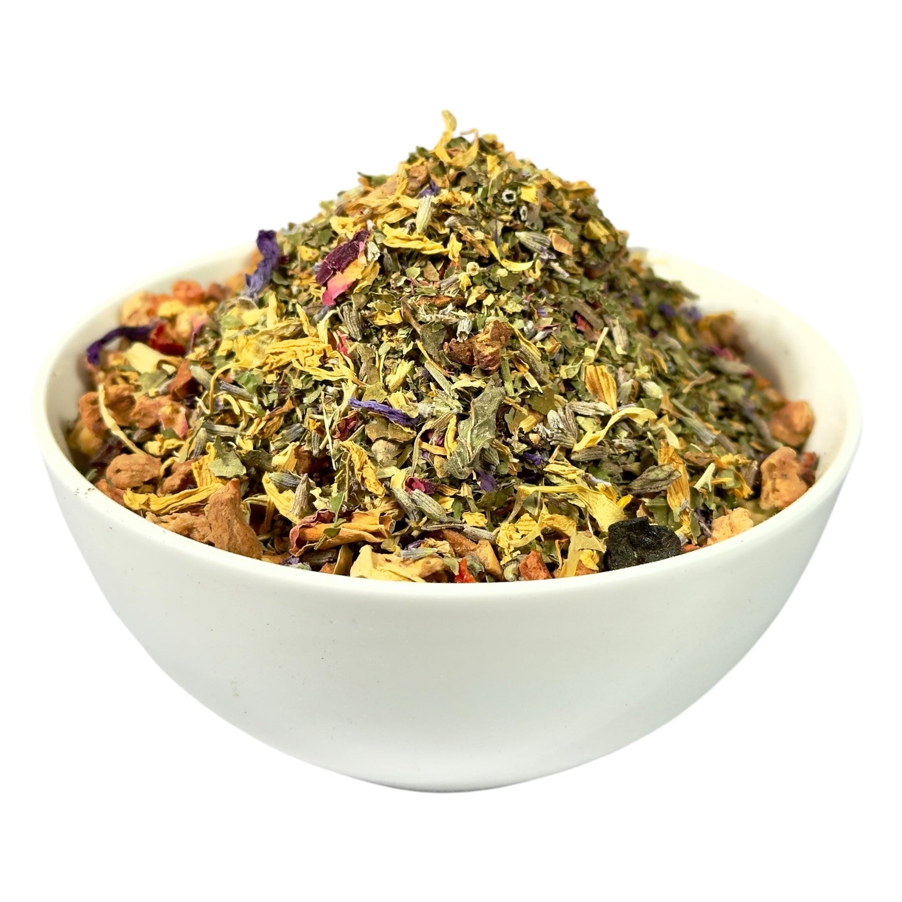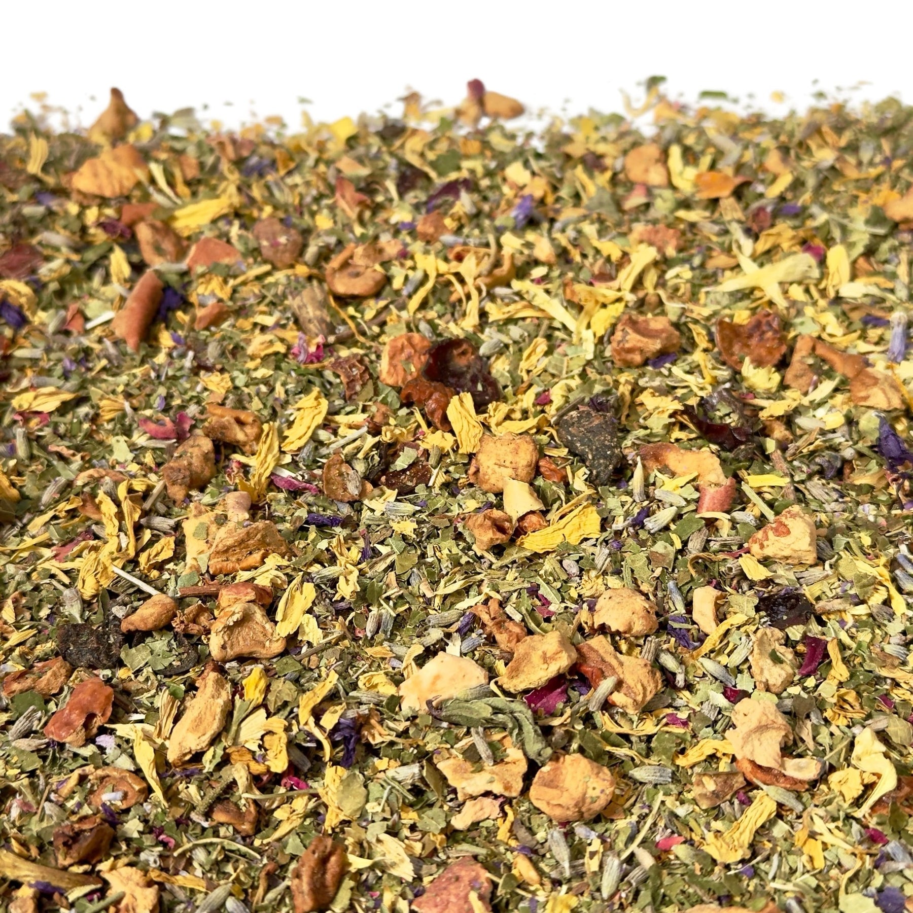 Zutaten: Apfelstücke, Haselnussblätter, Lavendelblüten, Sonnenblumenblüten, Hagebuttenschalen, Rosenblütenblätter, Malvenblüten, Ringelblumenblüten, Pfefferminze
