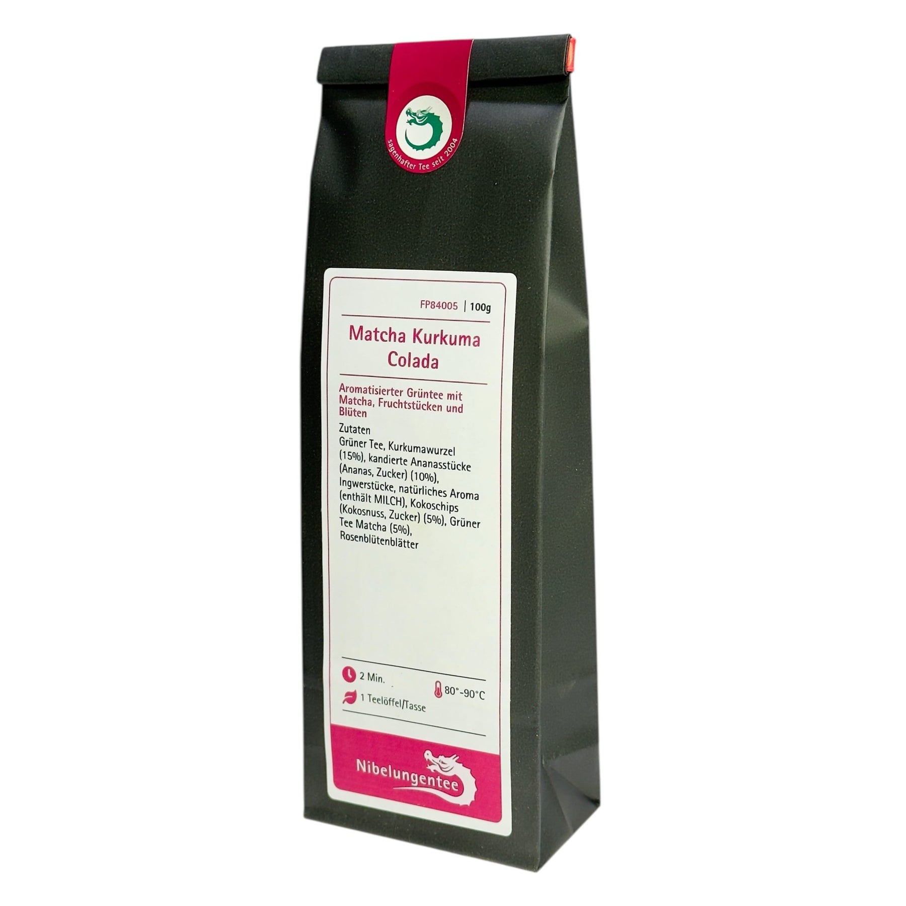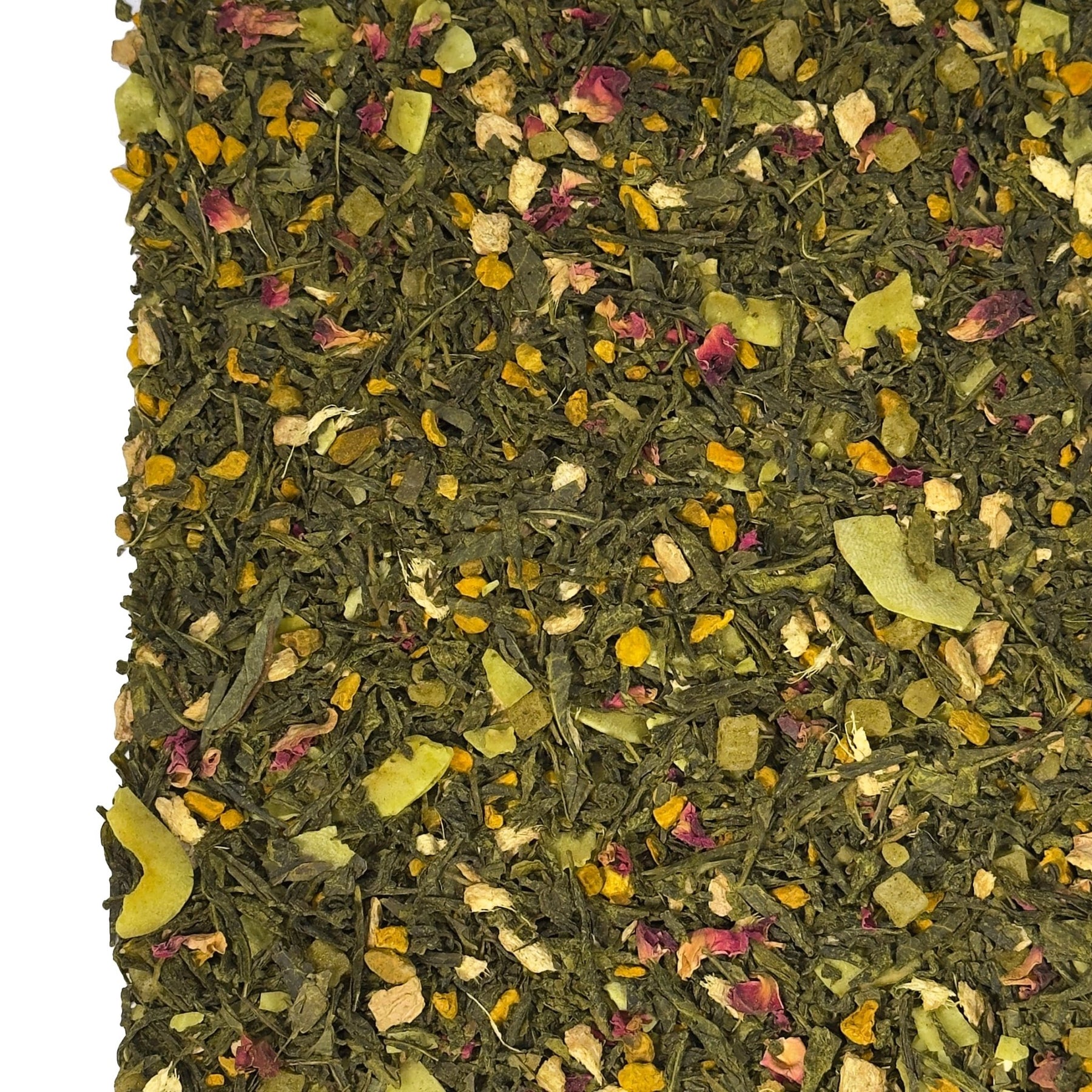 | Zutaten: | Grüner Tee, Kurkumawurzel (15%), kandierte Ananasstücke (Ananas, Zucker) (10%), Ingwerstücke, natürliches Aroma (enthält MILCH), Kokoschips (Kokosnuss, Zucker) (5%), Grüner Tee Matcha (5%), Rosenblütenblätter |