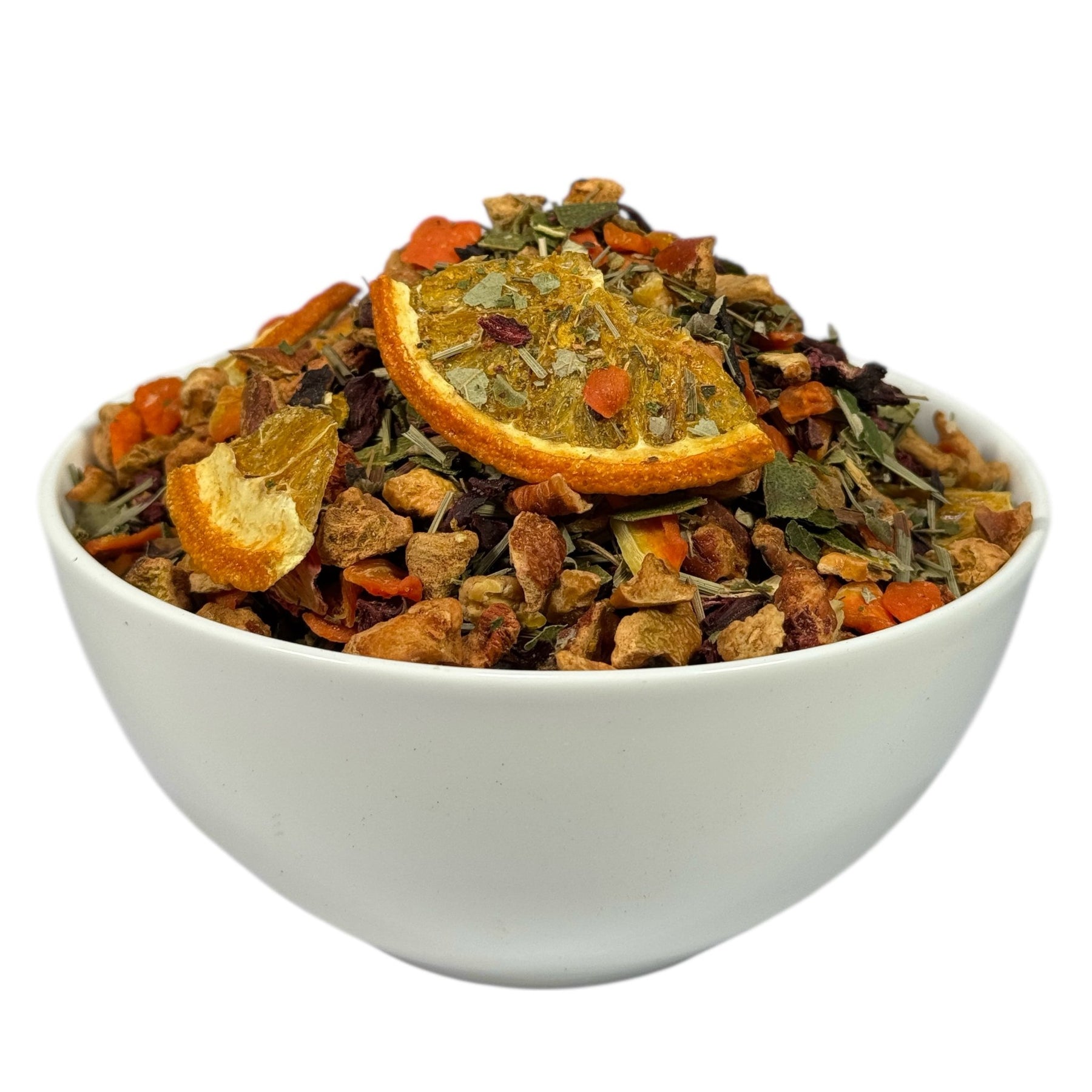Zutaten: Apfelstücke, Karottenflocken, Brombeerblätter, Eukalyptusblätter, Rote-Beete-Stücke, Hibiskusblüten, Zitronengras, Aroma, gefr.-getr. Mandarinorangenfruchtstücke, Orangenspalten