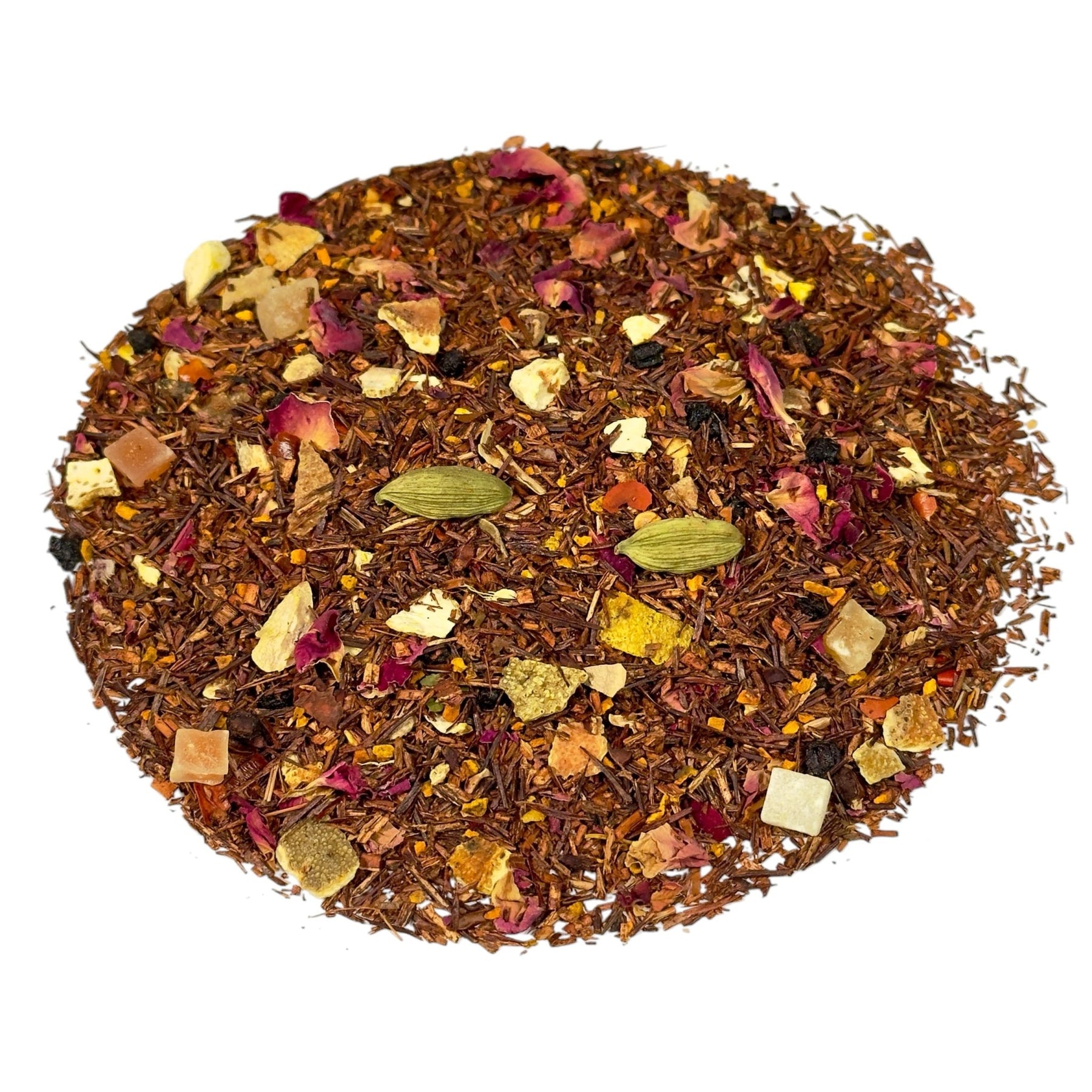 Rooibos, auch als Rotbusch bekannt, stammt ursprünglich aus Südafrika und überzeugt mit einem milden, leicht süßlichen und angenehm erdigen Aroma. Diese weiche Basis bietet den idealen Raum für Gewürze, die mehr Tiefe und Ausdruck ins Spiel bringen.