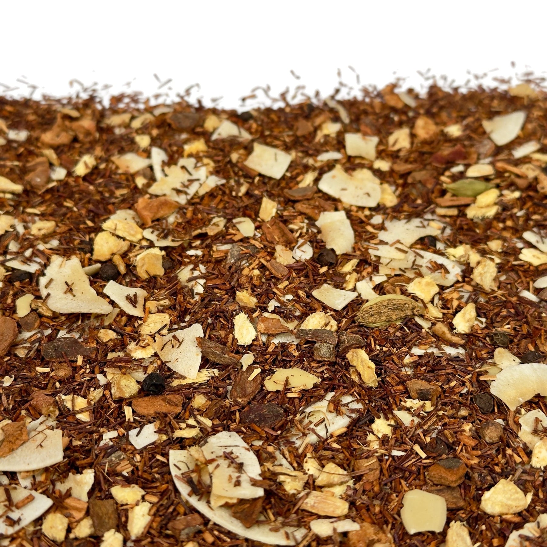 Zutaten: Rooibos, Ingwerstücke (18%), Kokoschips (Kokosnuss, Zucker) (15%), Zimtrinde, Apfelstücke, Aroma, Kardamom, schwarzer Pfeffer, MANDELFLAKES