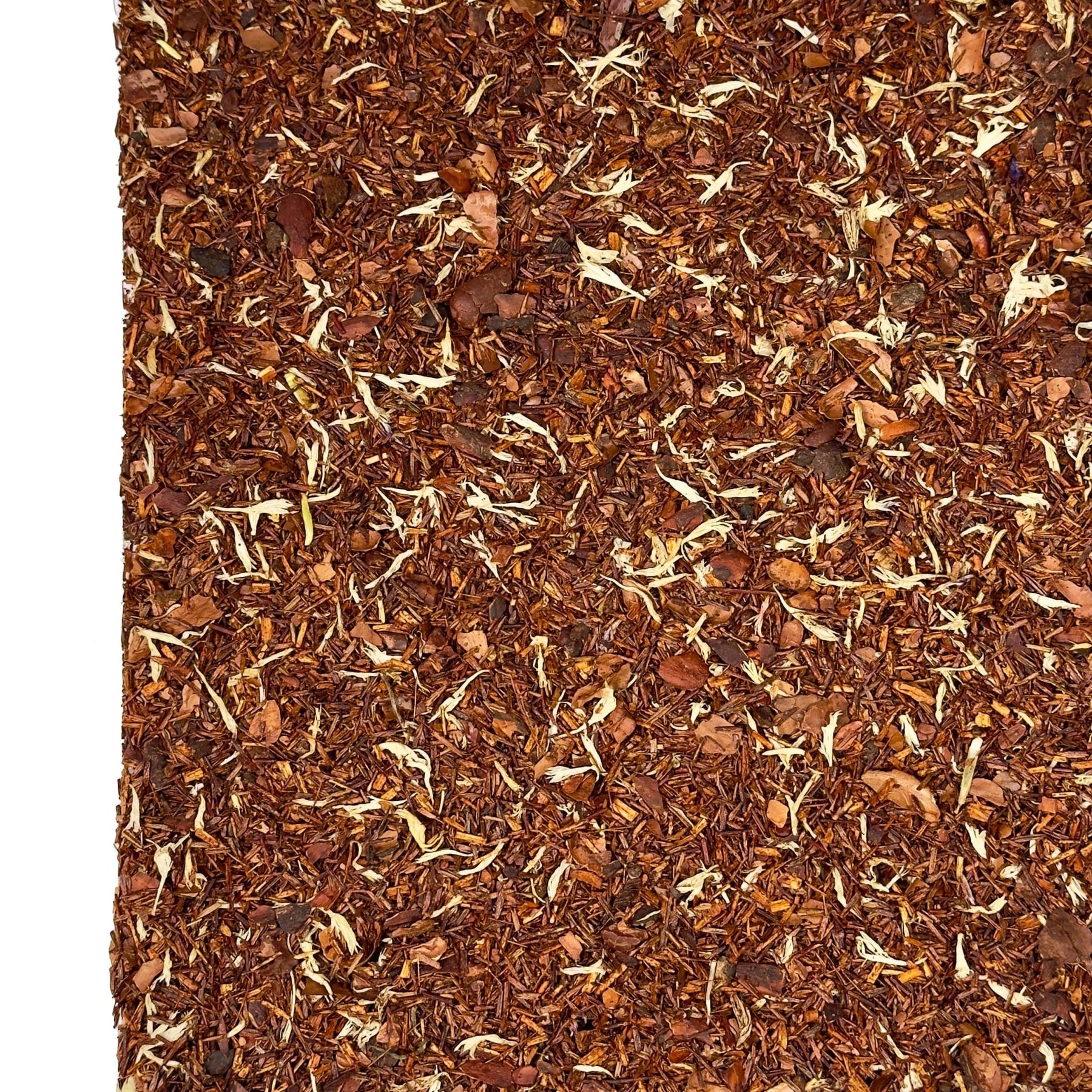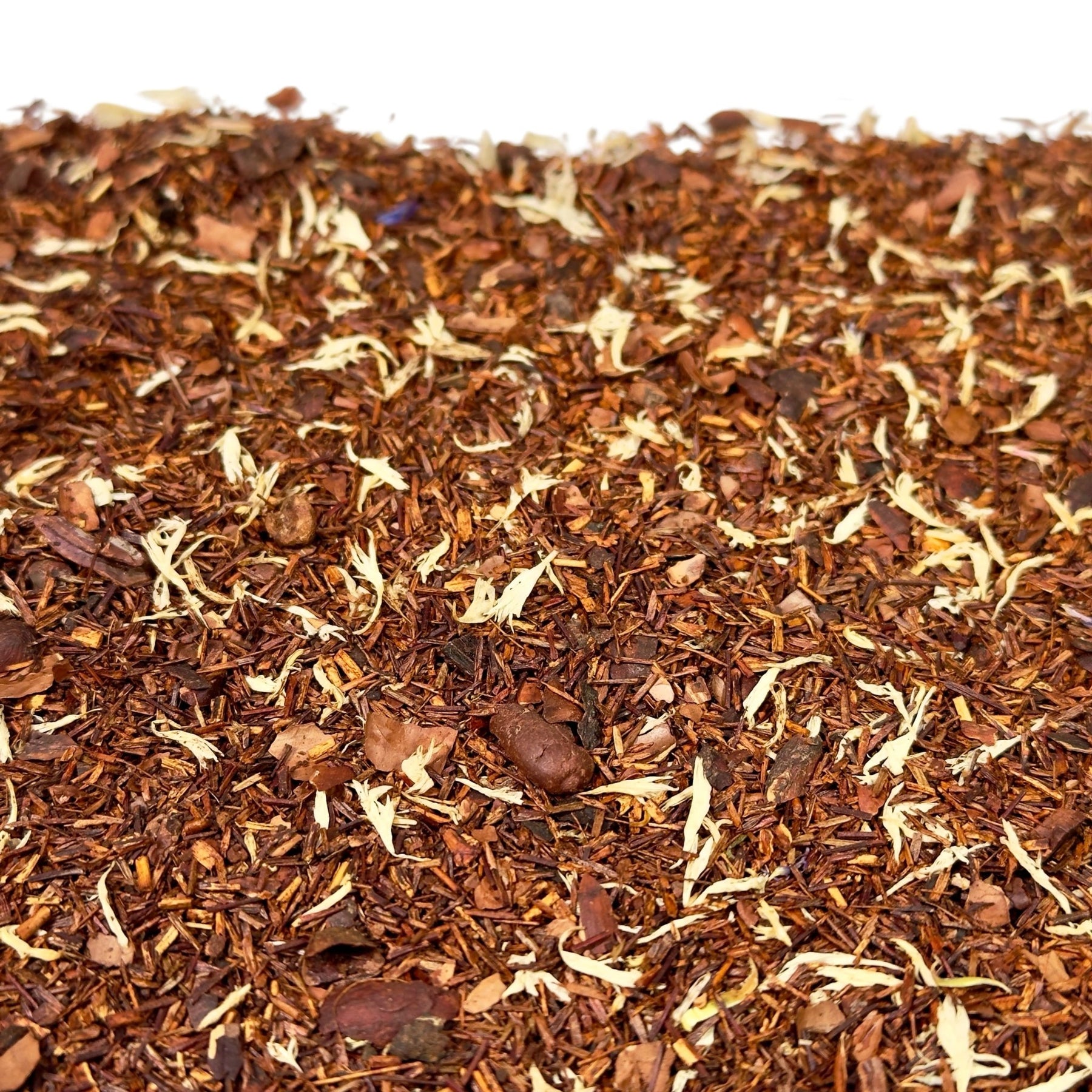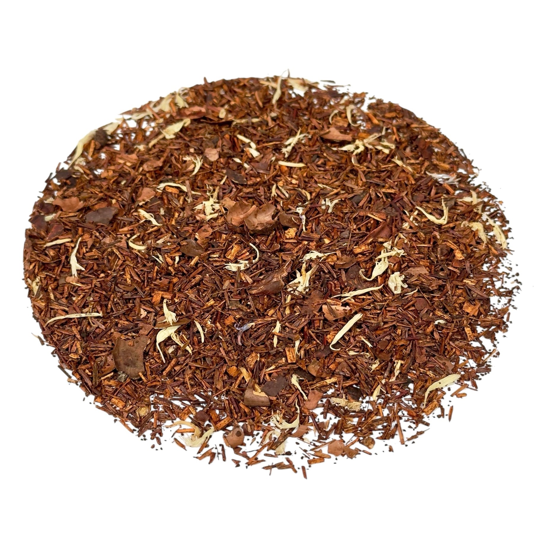 Die Grundlage bildet Rotbuschtee, der ursprünglich aus Südafrika stammt und für seine angenehm milde, leicht süßliche Note bekannt ist. Seine warme, rotbraune Farbe und das runde Aroma schaffen eine ruhige Bühne für die intensiveren Geschmacksnuancen der Mischung.
