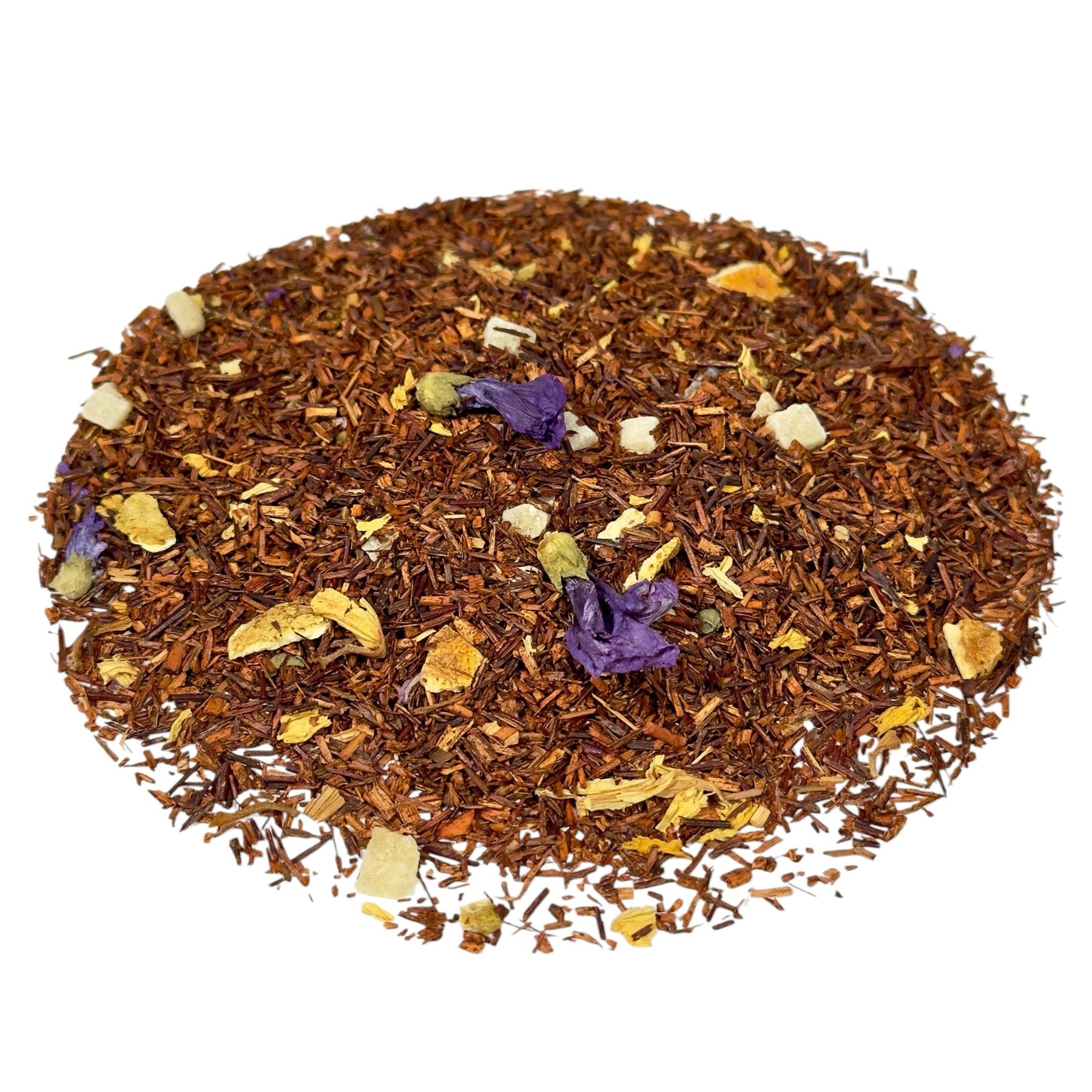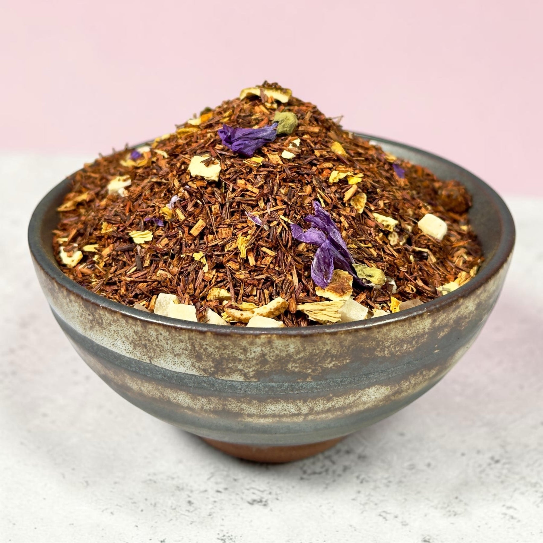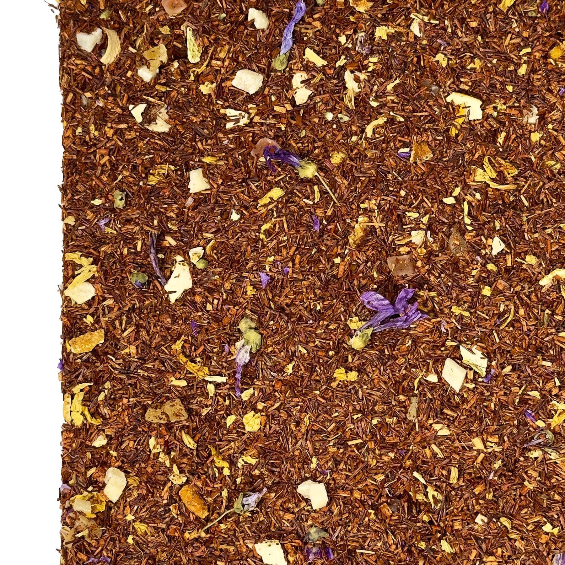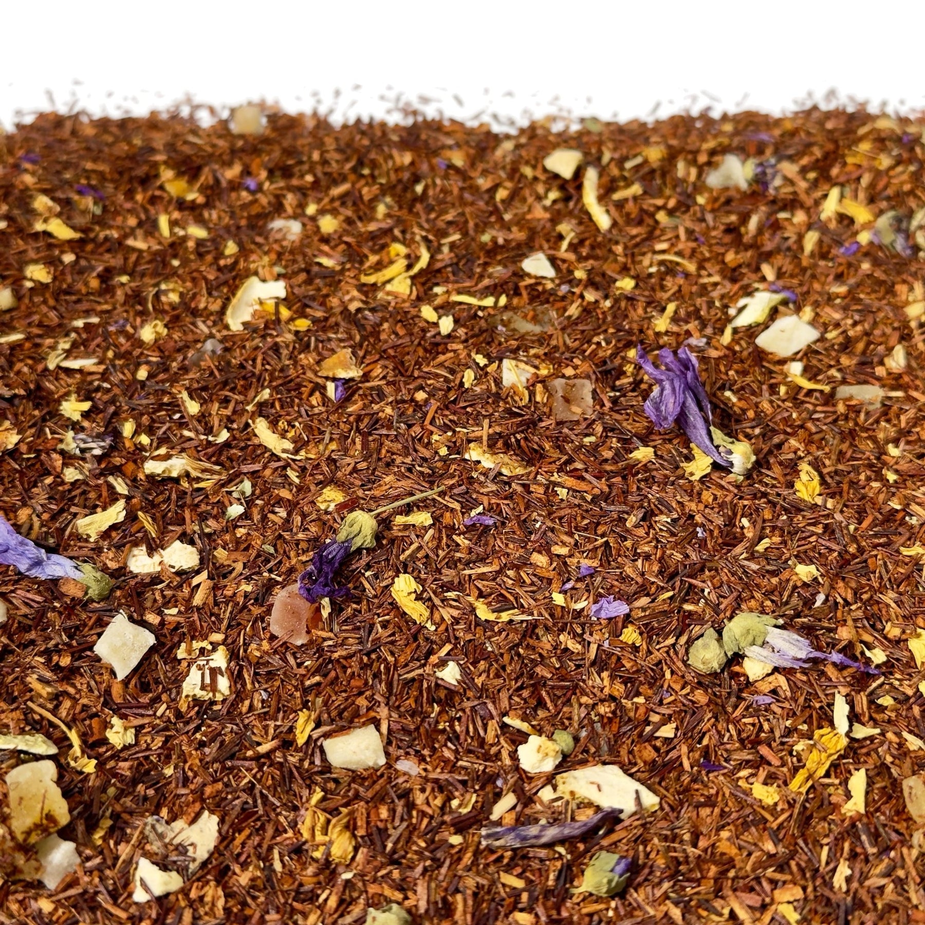 Die Basis bildet ein milder Rotbuschtee, der für seine weiche und sanfte Art bekannt ist. Dadurch entsteht ein angenehmes Fundament, auf dem sich die fruchtigen Noten besonders gut entfalten können. Genau diese Balance sorgt dafür, dass die Mischung weder zu intensiv noch zu zurückhaltend wirkt.