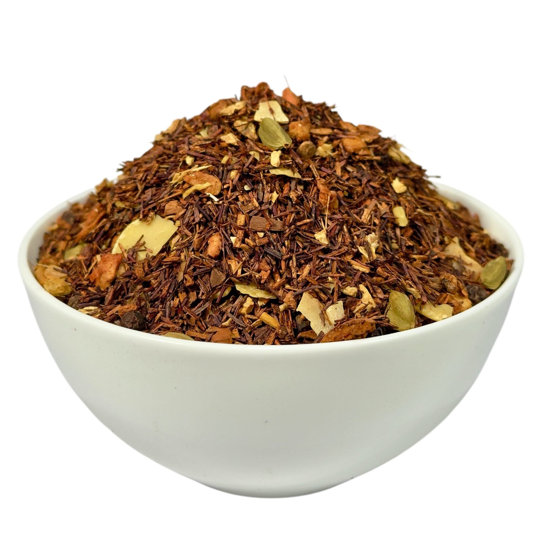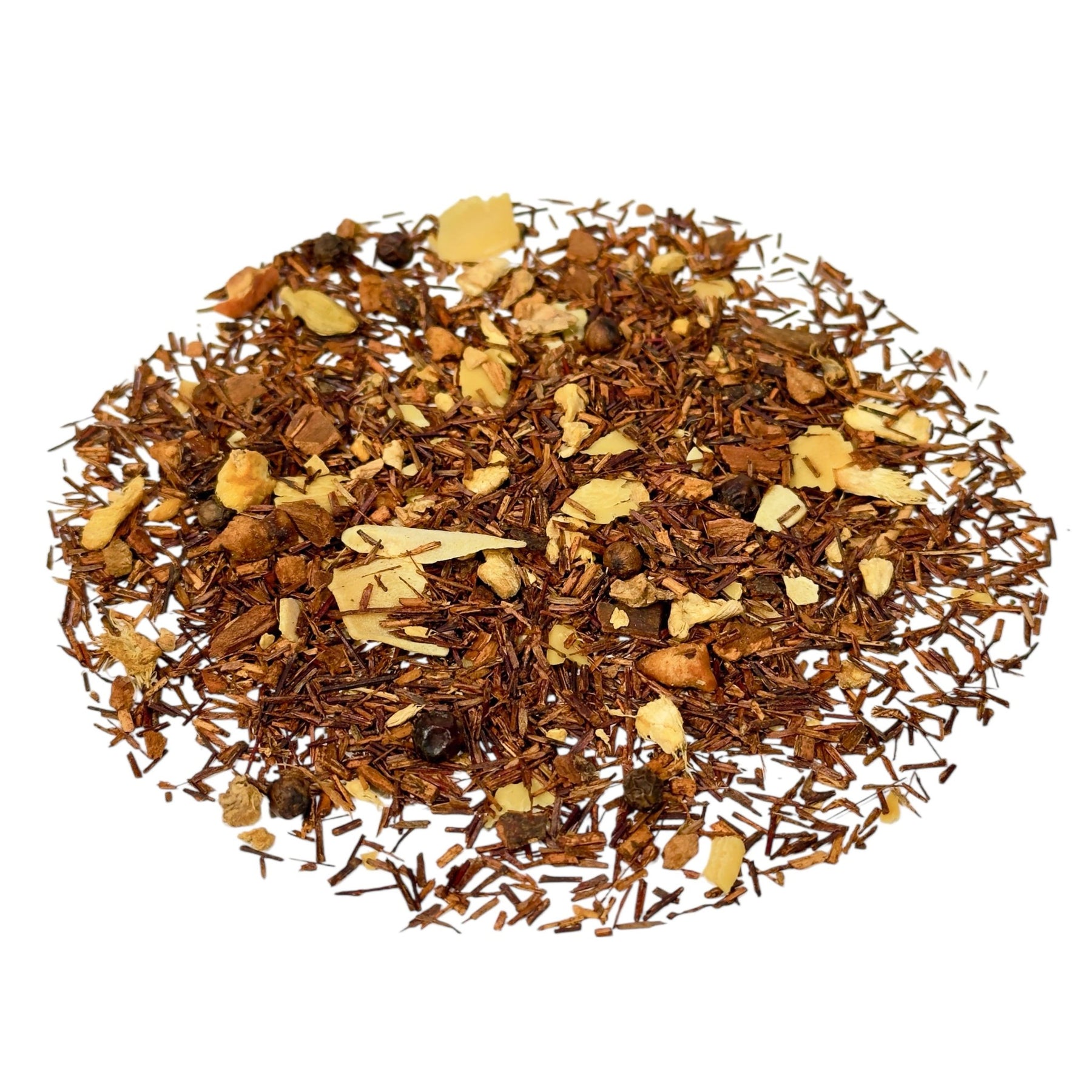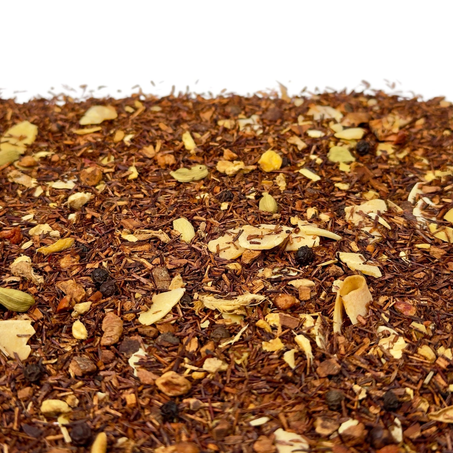 Zutaten: Rotbuschtee (45%), Ingwer (10%), Zimtstücke (10%), Apfelstücke, KOKOSNUSSCHIPS (8%), Aroma, Kardamom, Schwarzer Pfeffer, MANDELSTÜCKE