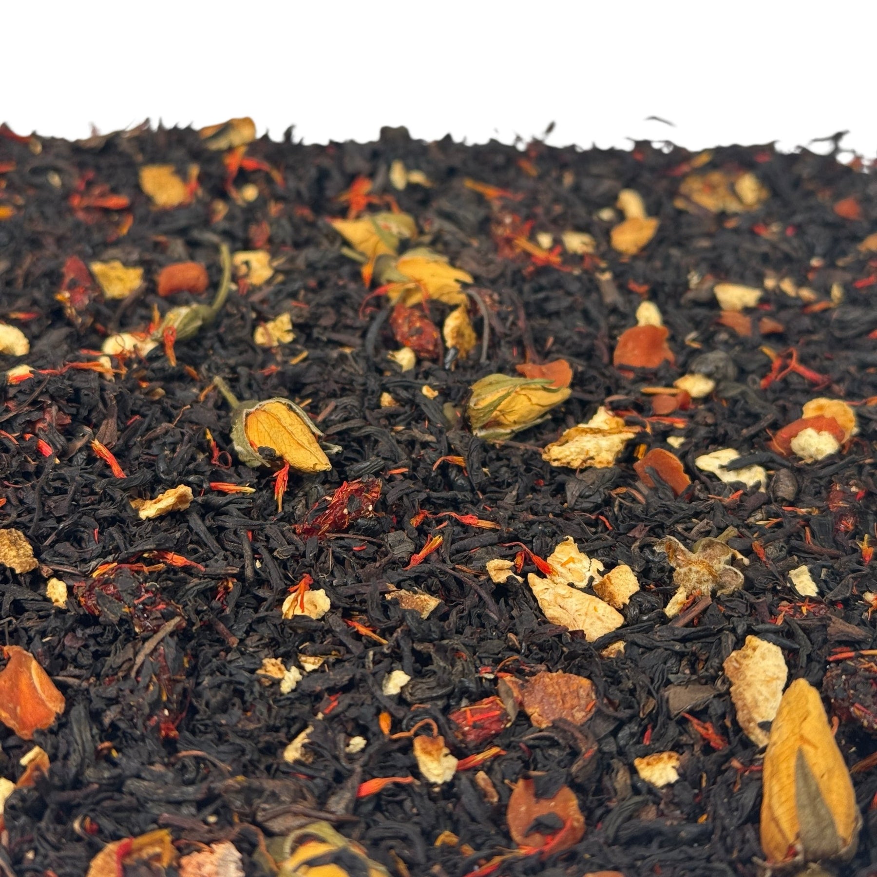 Zutaten: | schwarzer Tee (71 %), Orangenschalen, Gojibeeren, Aroma, Karottenflocken, gelbe Rosenknospen, Färberdisteln |