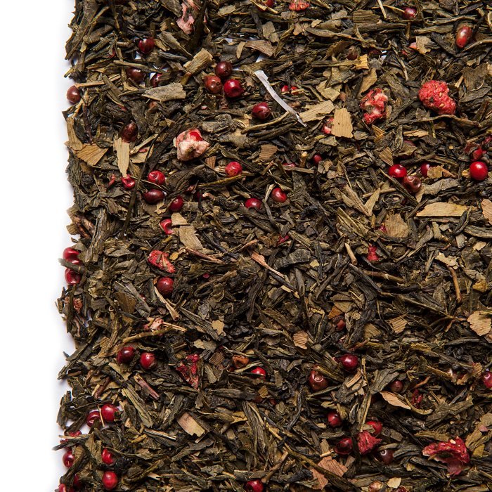 Wir sind keine Meister im Reimen, sondern komponieren lieber erlesene Teemischungen wie diesen feinen Sencha mit Ginkgoblättern. Rosa Pfefferkörner verleihen dem aromatisierten Grüntee eine leichte Schärfe, die perfekt mit den süßen Erdbeerstücken harmoniert. Das Ganze ist auch optisch ein Gedicht und damit pure Poesie – besser gesagt: Grüne Poesie.