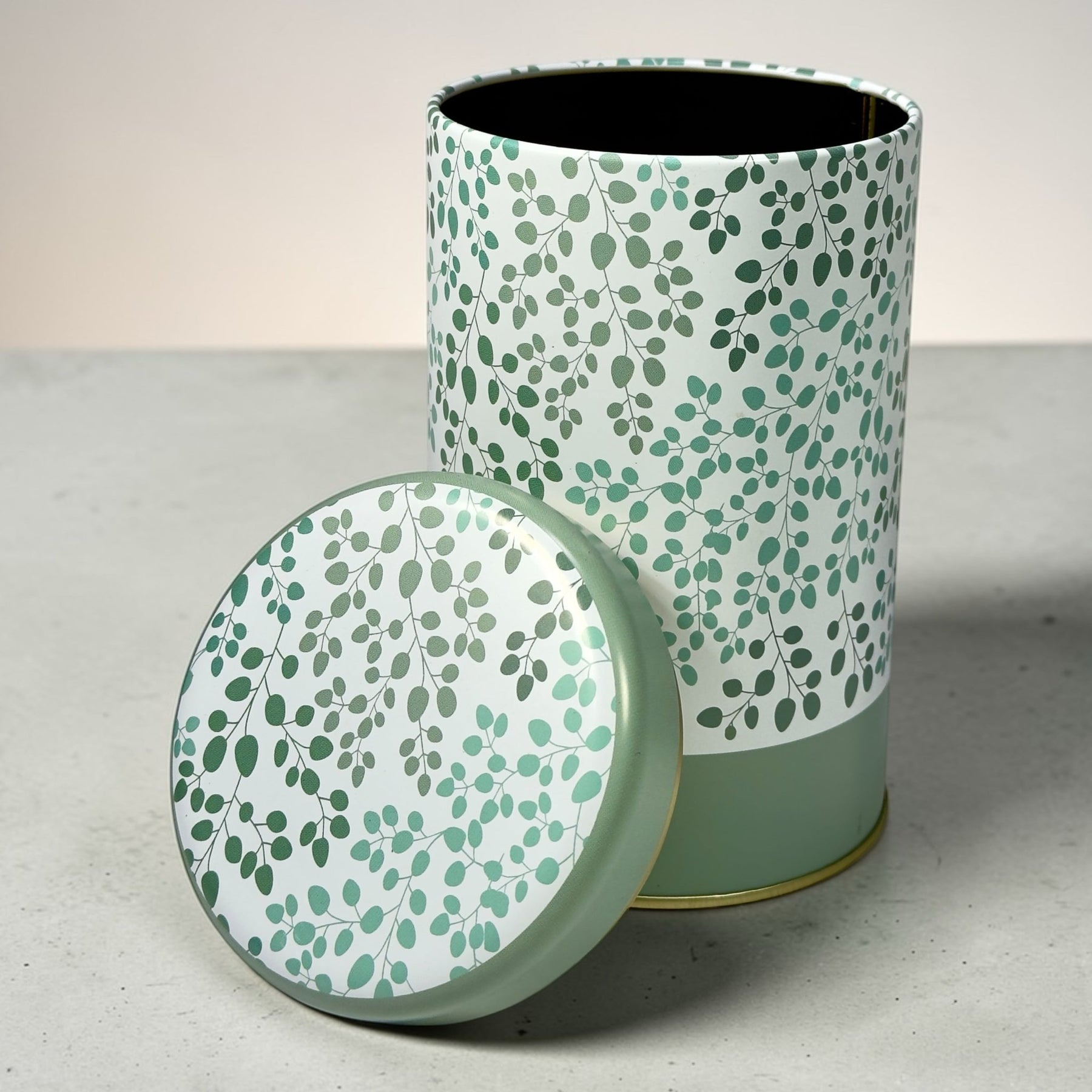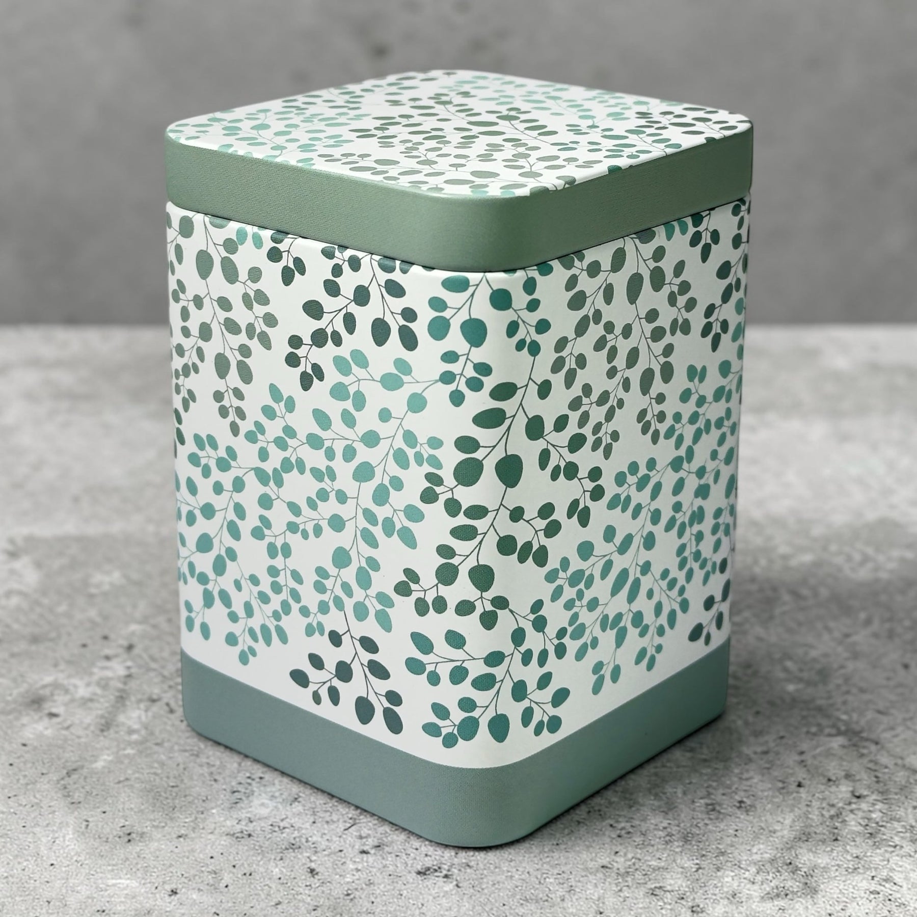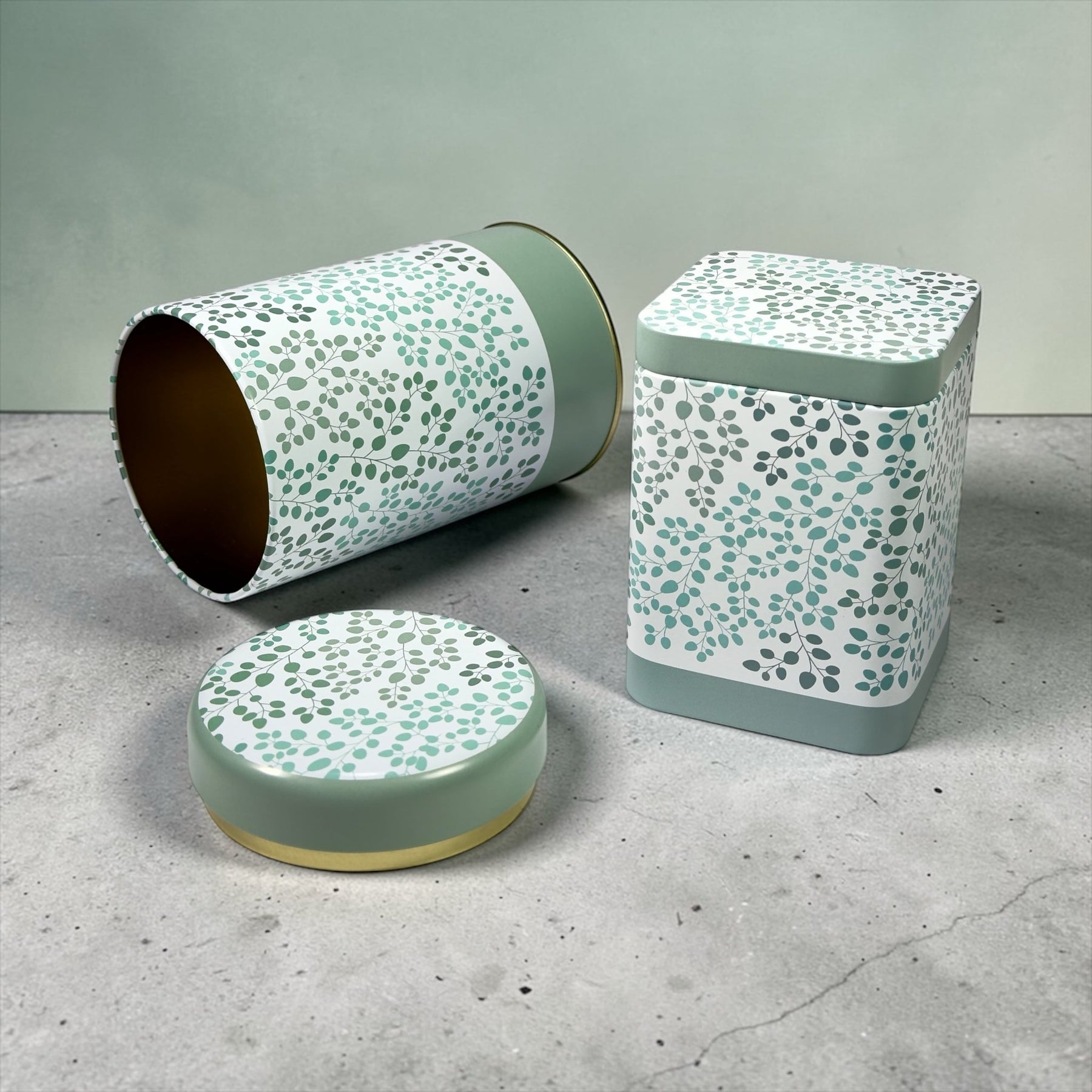 Manchmal sind es die leisen Töne, die einen Raum besonders stimmig wirken lassen. Genau dieses Gefühl vermittelt die Teedose Milea auf den ersten Blick. Zarte Blätter in soften Pastellnuancen ziehen sich über die Oberfläche und werden von einem eukalyptusfarbenen Sockel sowie einem farblich abgestimmten Deckelrand eingerahmt. Das Zusammenspiel wirkt ruhig, leicht und wunderbar harmonisch.
