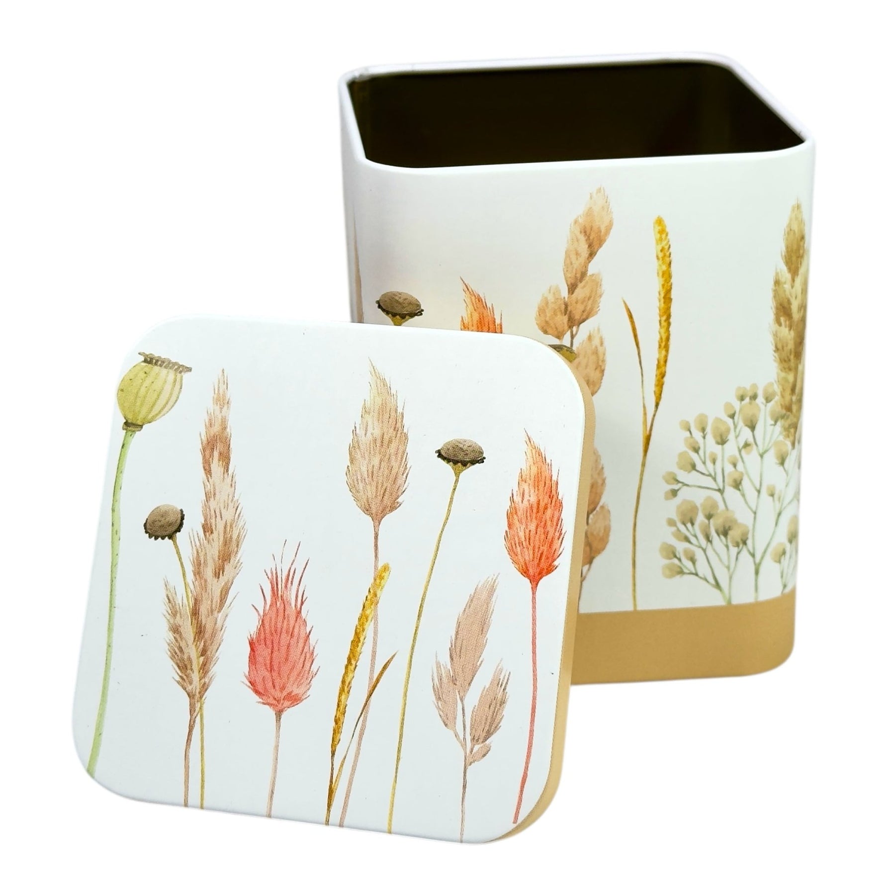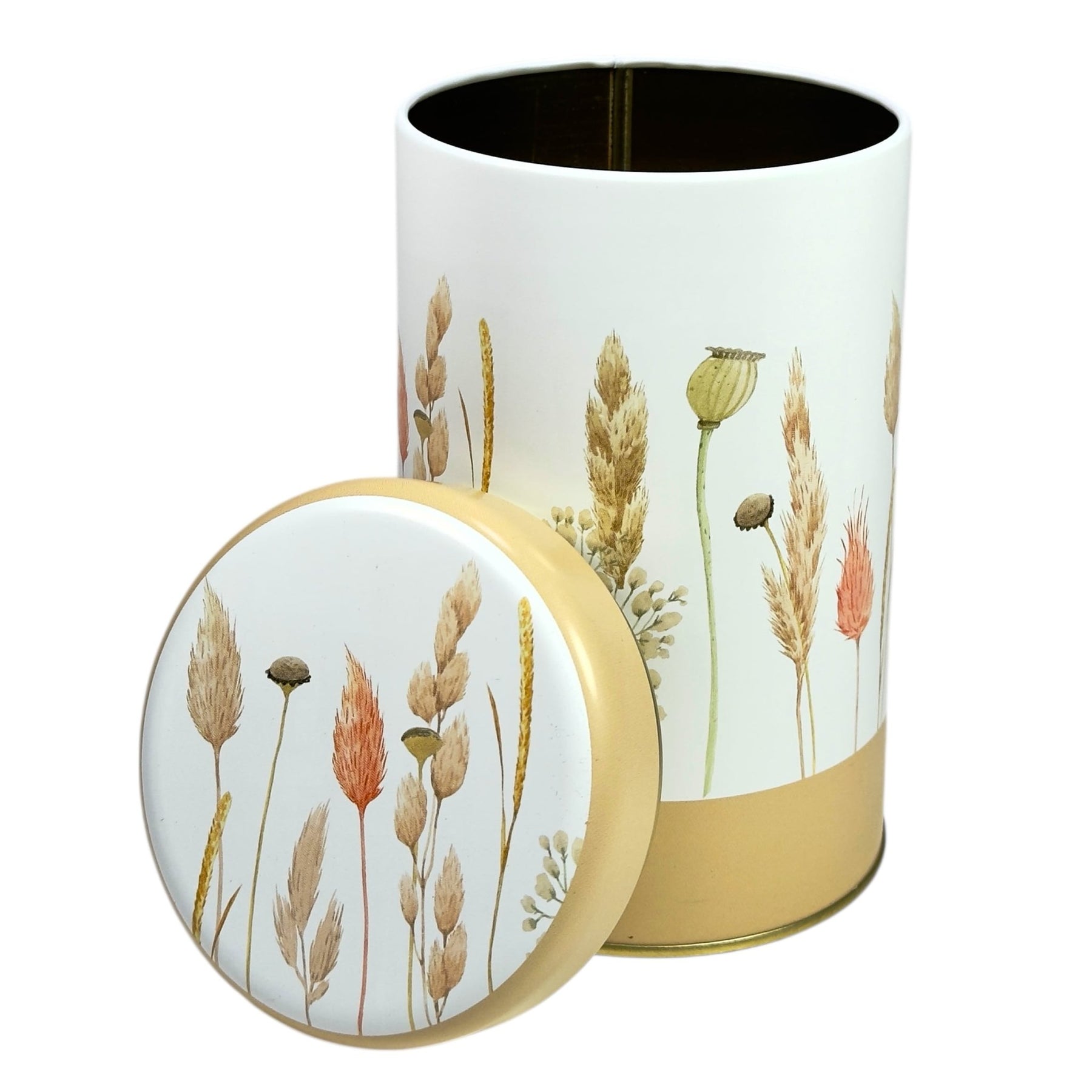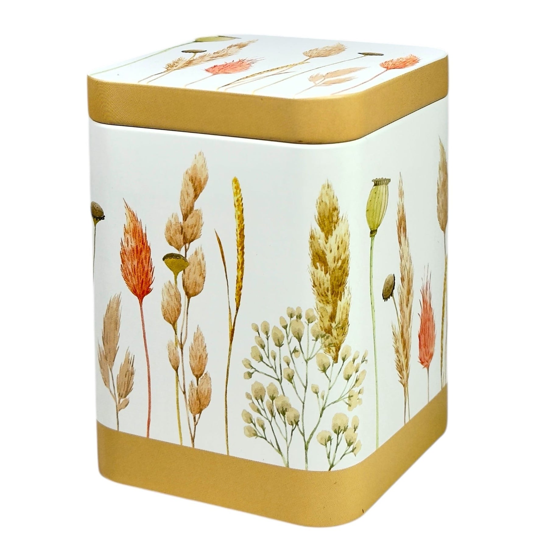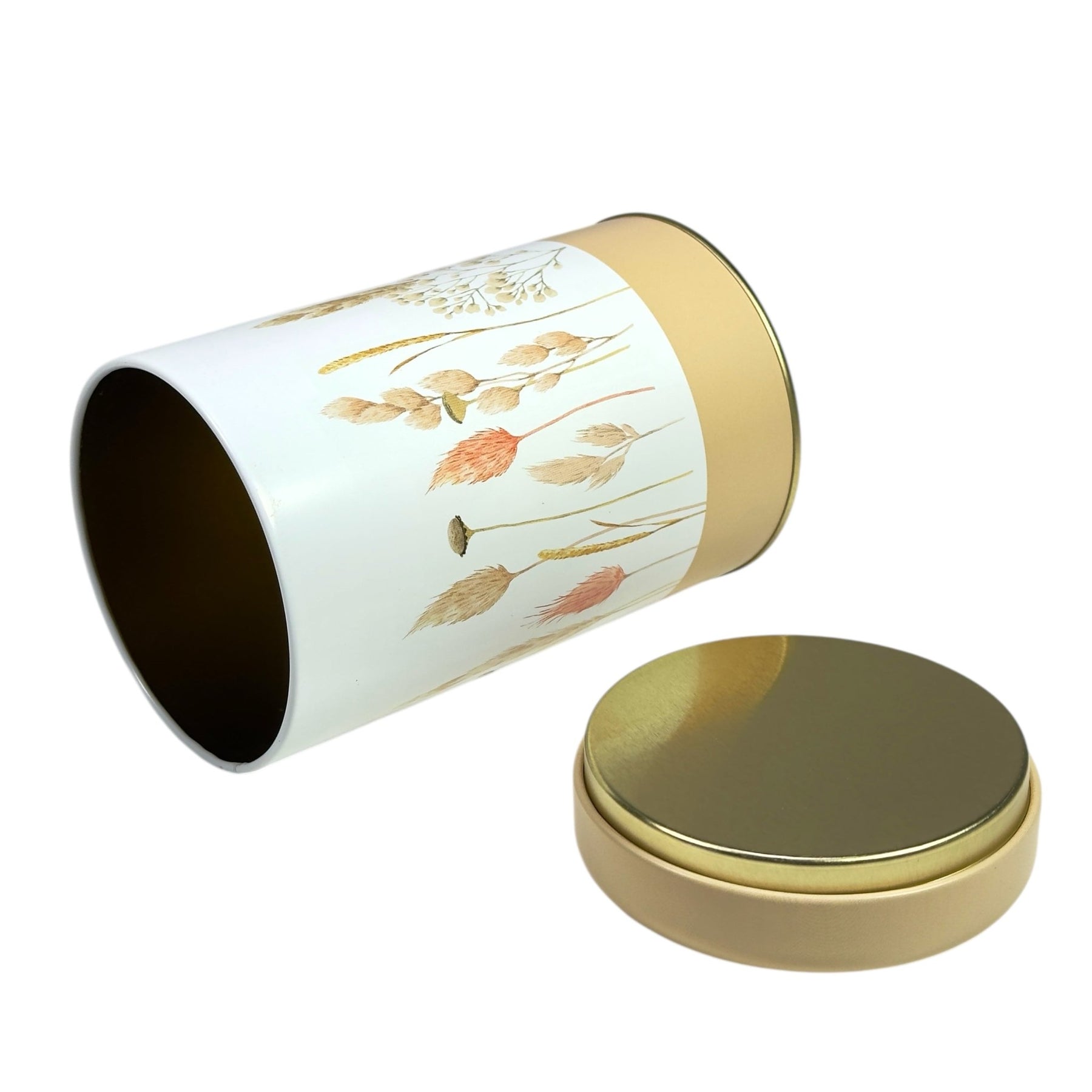 Die Farbwelt des Designs wird vor allem von Trockenblumen und Gräsern in verschiedenen Cremetönen geprägt. Diese sanften Nuancen verleihen der Dose eine besonders feine und elegante Optik und schaffen eine warme, harmonische Atmosphäre. Ergänzt wird das Gesamtbild durch den beigefarben abgesetzten Sockel, der den natürlichen Look stimmig abrundet und das Design optisch erdet.