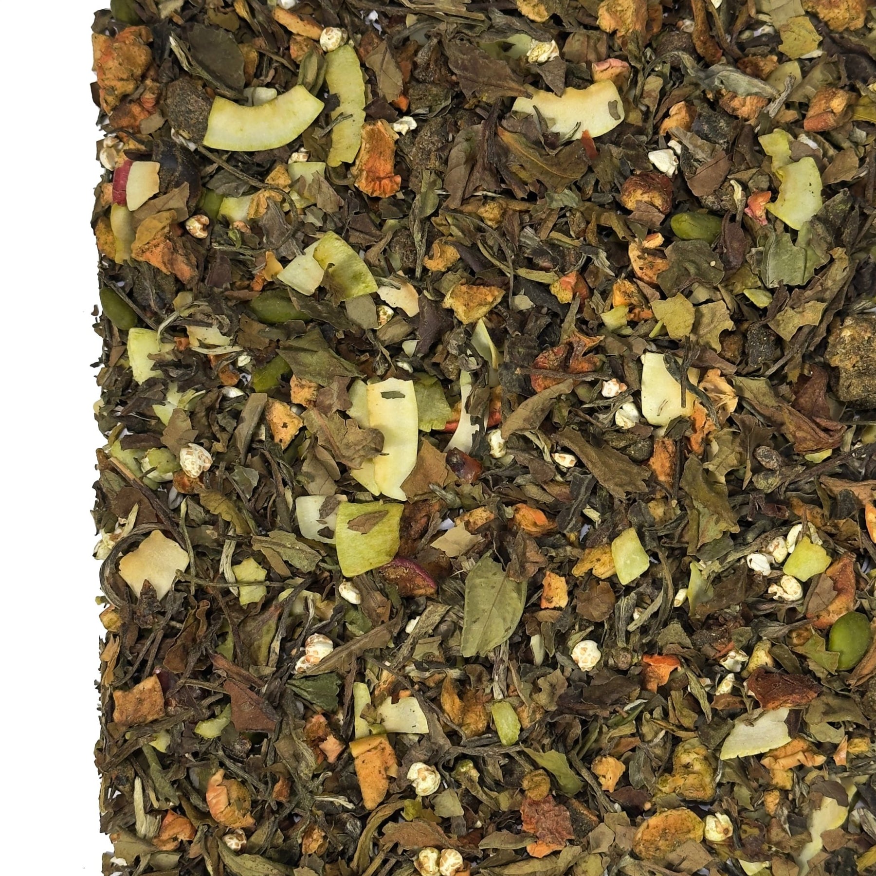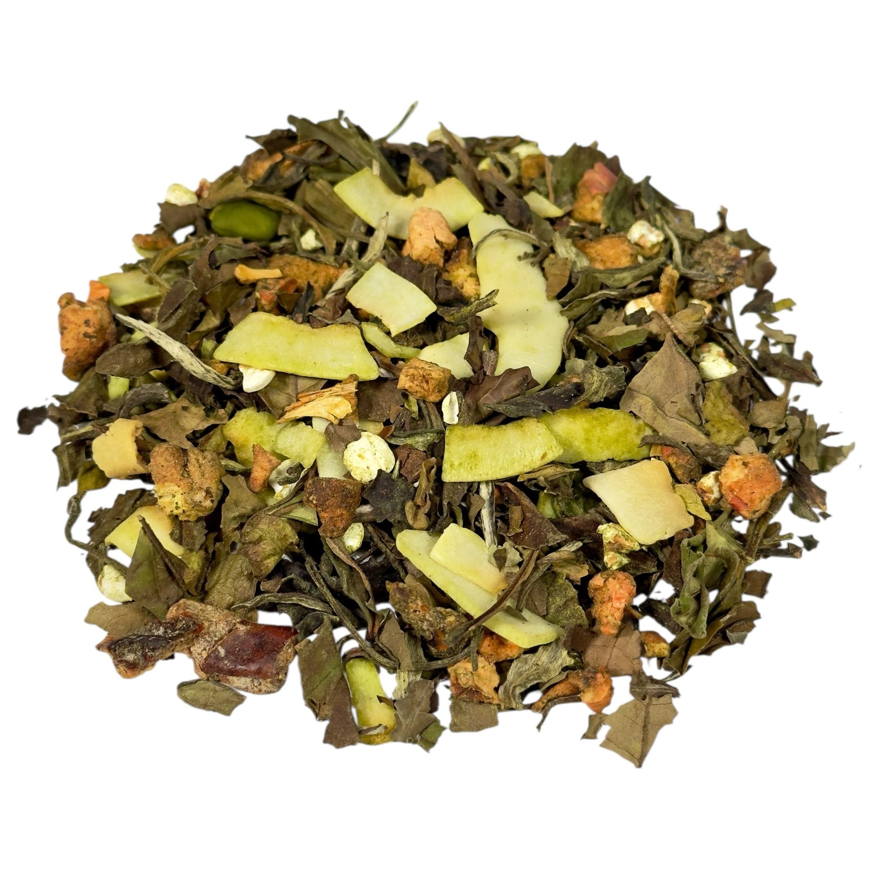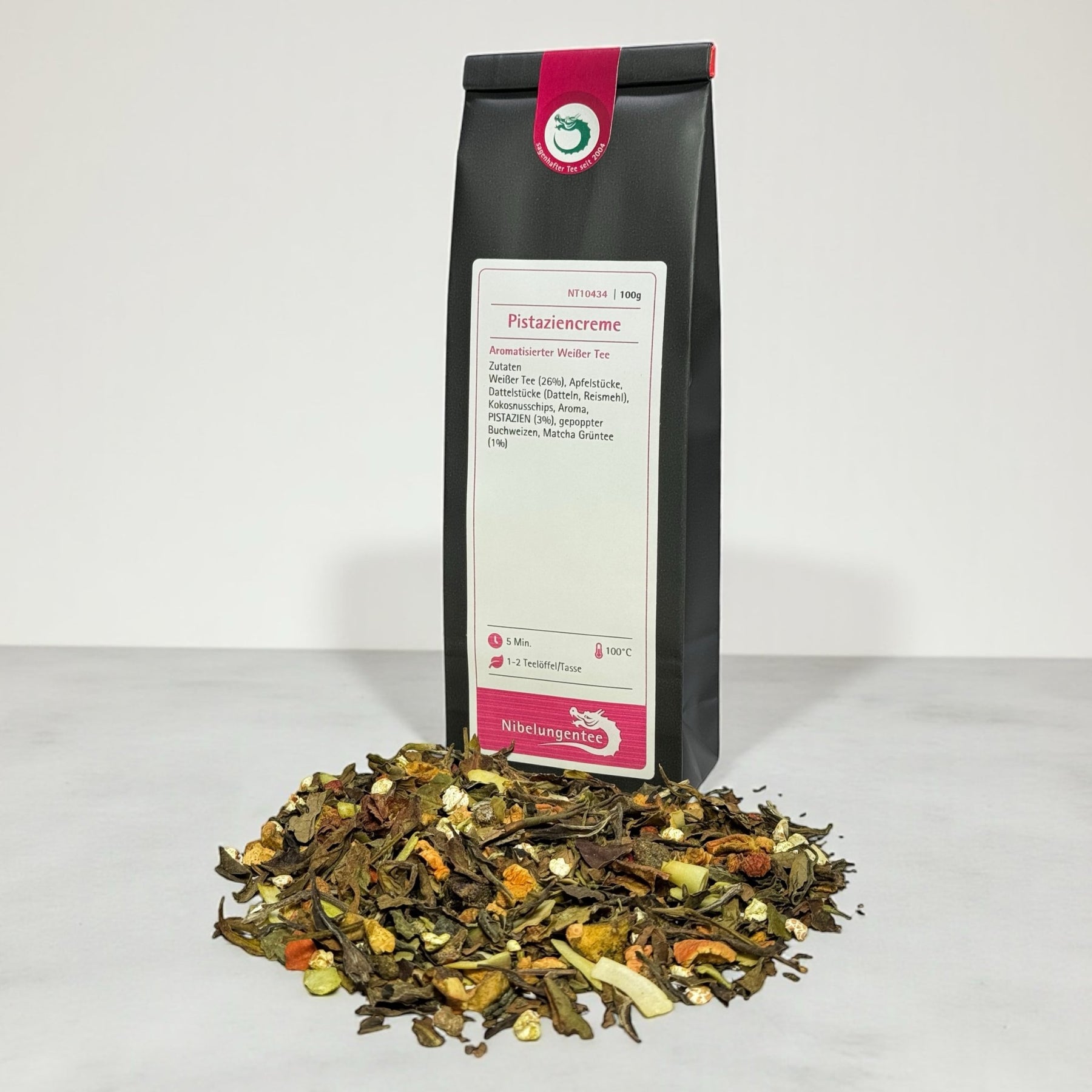 | Zutaten: | Weißer Tee (26%), Apfelstücke, Dattelstücke (Datteln, Reismehl), Kokosnusschips, Aroma, PISTAZIEN (3%), gepoppter Buchweizen, Matcha Grüntee (1%) |